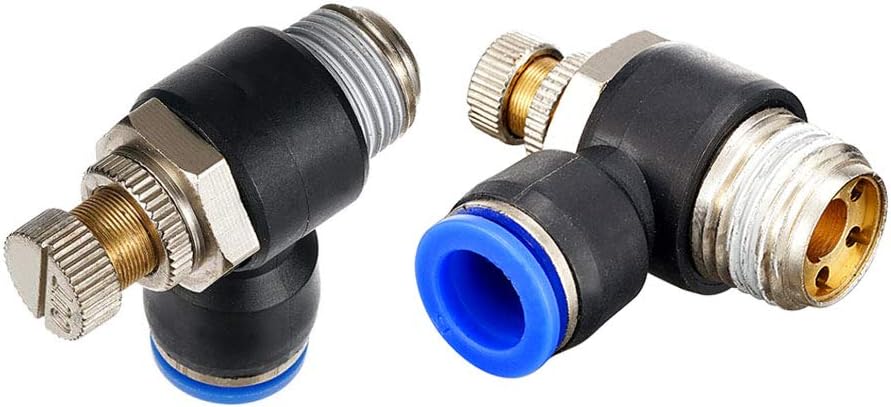 The flow control valve is housed in a banjo-style body with a 90-degree angle and is suitable for use in metering outlet air flow in pneumatic applications. A knobbed screw with a locking nut is used to adjust air flow on the outlet side. The banjo body is impact-resistant, the brass threaded fitting is corrosion-resistant, and the nitrile butadiene rubber (NBR) O-ring is resistant to oil and chemicals. The banjo body has a female push-to-connect tubing end and the housed brass fitting has a male BSP thread. It has a maximum operating pressure of 145 pounds per square inch (psi) and a working temperature range of 32 to 158 degrees F. This air flow control valve is suitable for use in pneumatic applications such as in laboratories, food and beverage processing, and paint and printing industries.