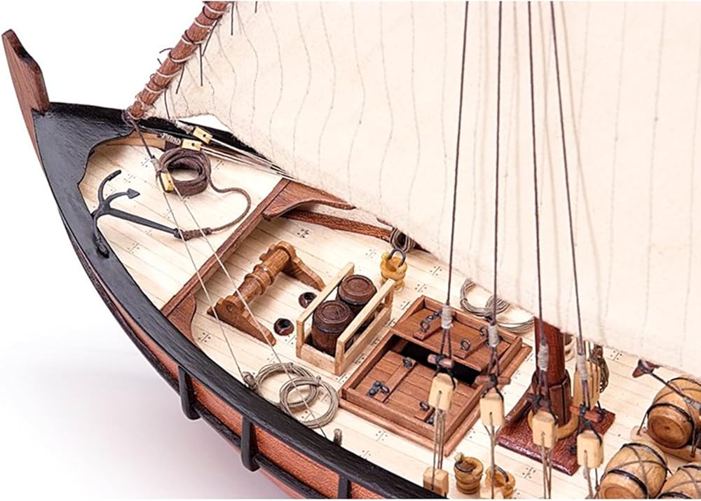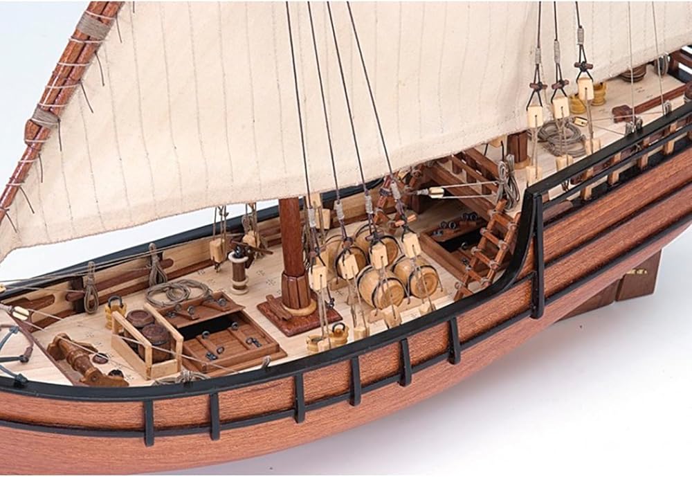 Ship model for adults. Modelling kit to build intermediate level. The model is made up of high-precision laser-cut wooden boards, birch wood and veneers, various photo-etched, cast and woven brass parts, as well as hand-sewn sails ready to be placed. Its assembly system by means of a false keel and frames resembles its design to that of the real ship.