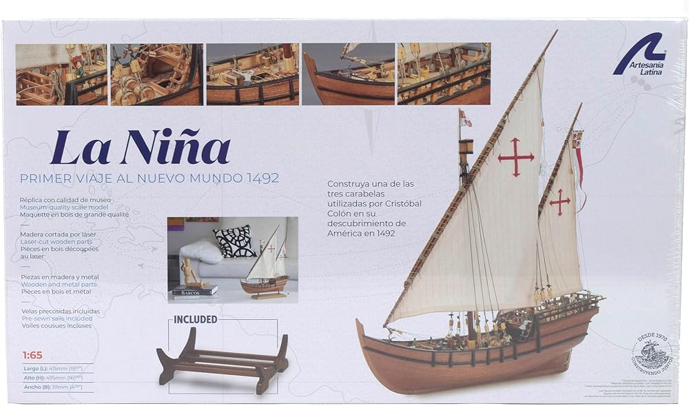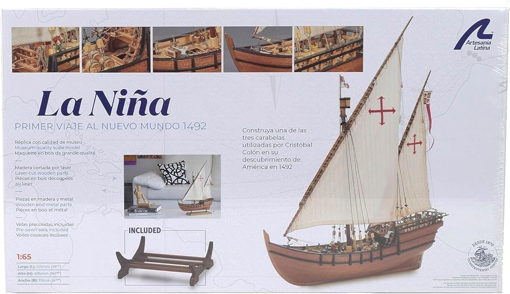 Build the wooden model of the caravel La Niña. The model kit includes all parts you need: hand-sewn sails, threads, wood, metal, prefabricated wooden pieces... In addiction to a complete and detailed full color set of instructions that will guide you in the construction. Discover the conditions in which they traveled in 1492 recreating this model.