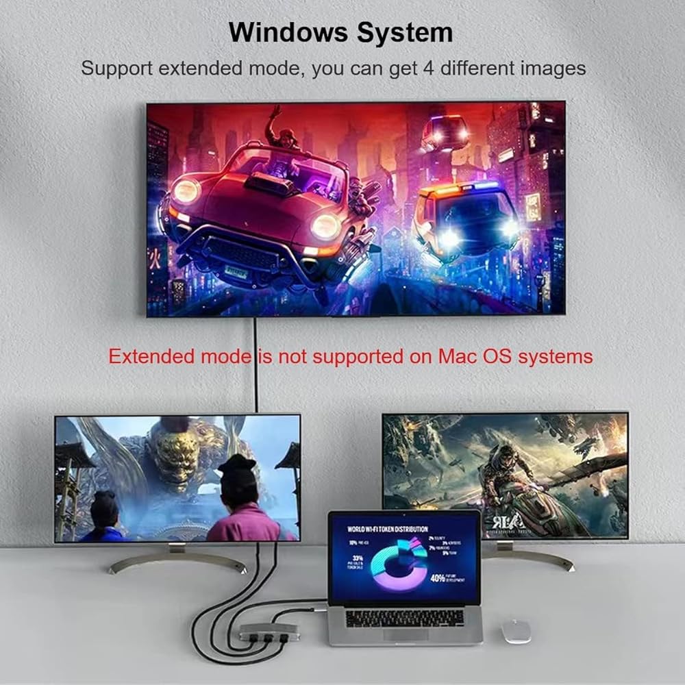【HD Resolution】 When using one HDMI port or two HDMI ports alone, it can output 4K@60Hz resolution at the same time. When three HDMI ports are used at the same time, one HDMI port supports 4K@60Hz, and the other two HDMI ports support 4K @30Hz, higher resolution can bring you a good visual experience and graphics processing