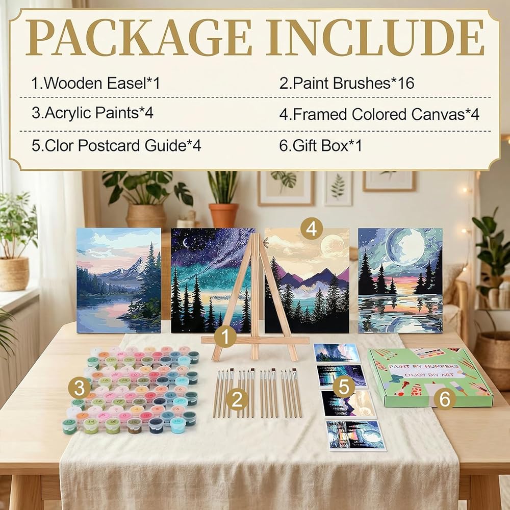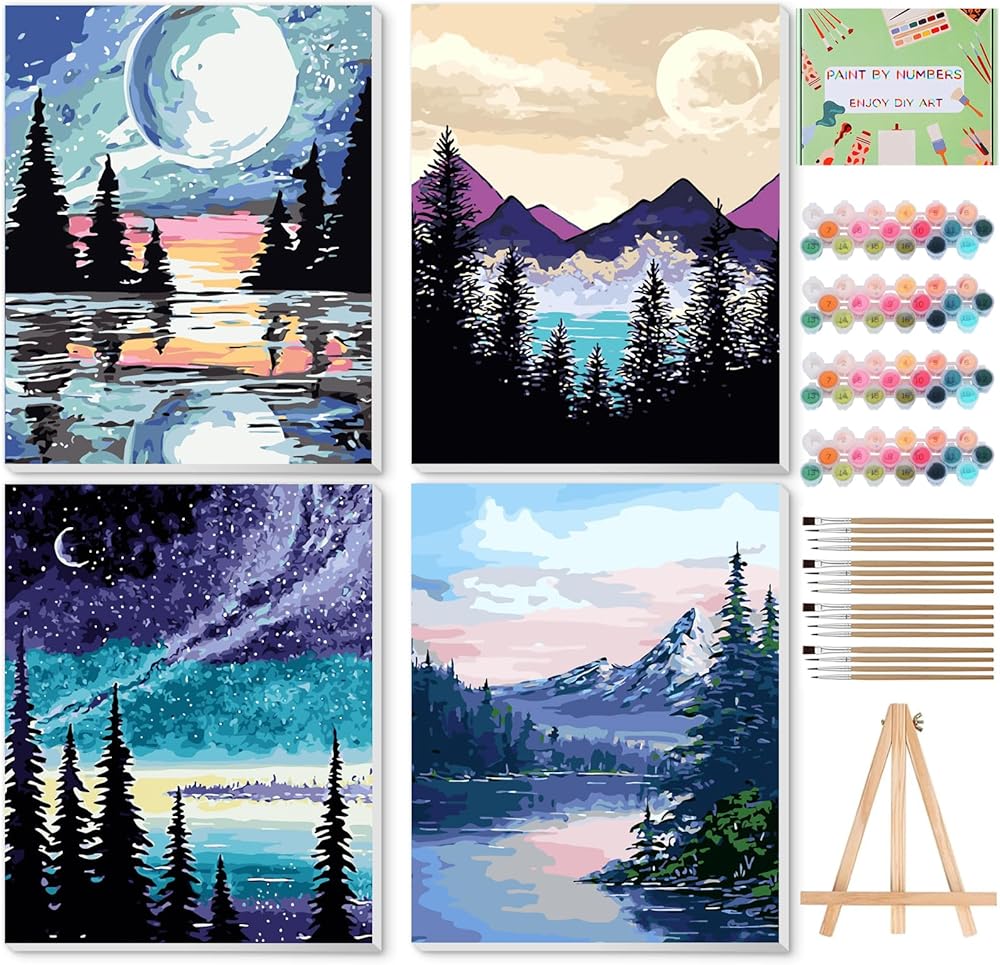 مجموعة الطلاء بالأرقام من نينونلي للبالغين مع 4 قطع من القماش المؤطر، مجموعة فنون الرسم ليلاً على شكل قمر للمبتدئين مع حامل خشبي، مجموعة أكريليك، فرش لديكور المنزل، 9 * 12 بوصة