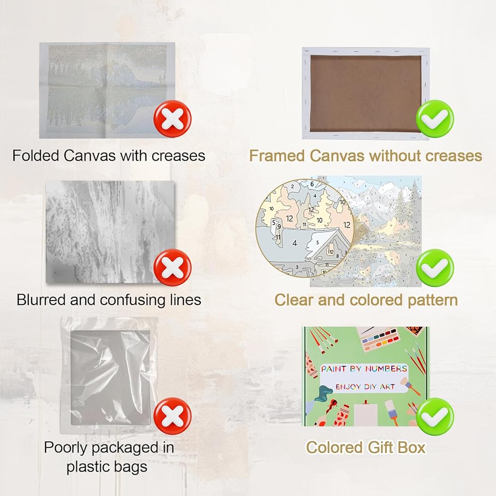 قماش مؤطر بدون تجاعيد - على عكس اللوحات القماشية المطوية أو الملفوفة الأخرى، فإننا نوفر مجموعة طلاء مؤطرة بالأرقام، والتي لا تتطلب الكي، ويمكن تعليقها مباشرة على الحائط كلوحات زخرفية بعد الانتهاء.