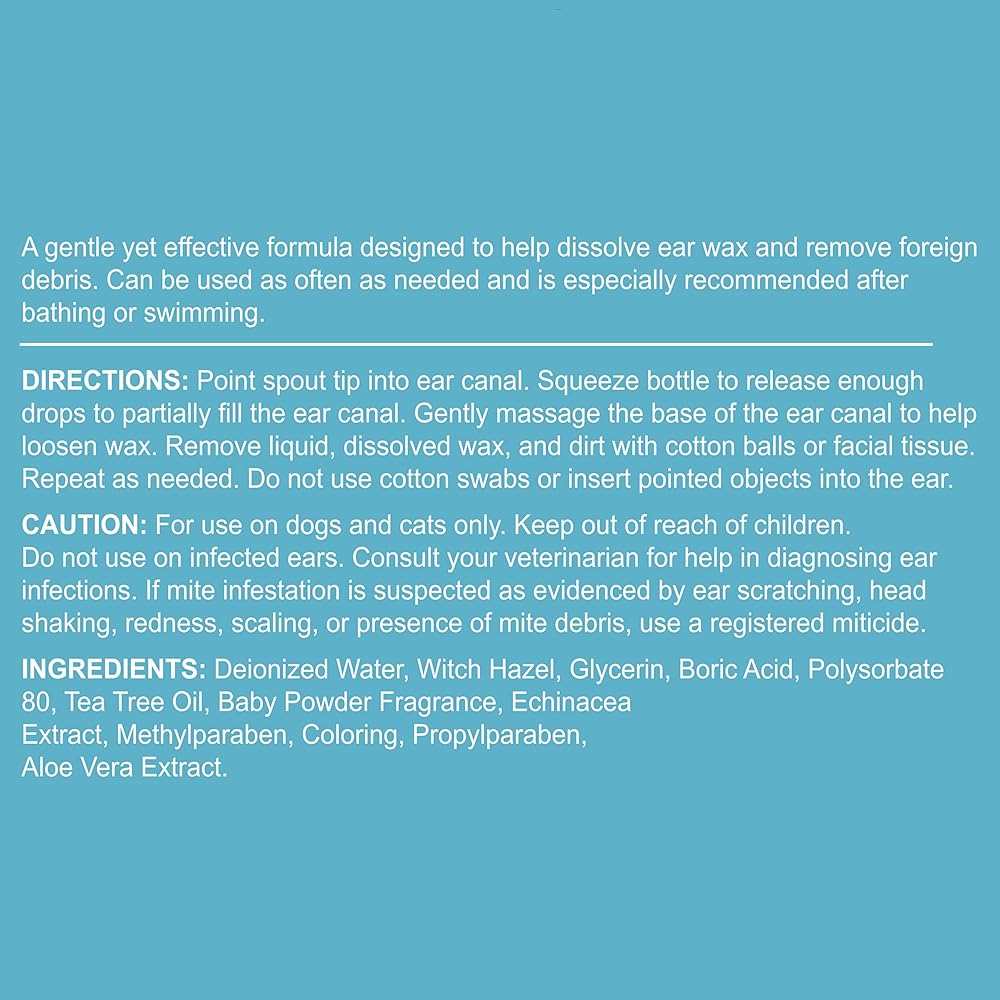لطيف وفعال: تم تركيبه من مكونات لطيفة وغير لاذعة مهدئة وآمنة ومريحة لأذني حيوانك الأليف. كما يقلل منظف أذن الحيوانات الأليفة هذا من الحكة ويزيل الرائحة الكريهة ويحتوي على رائحة بودرة الأطفال المنعشة.
