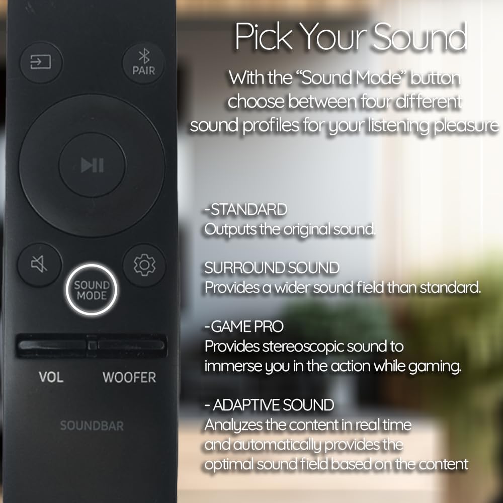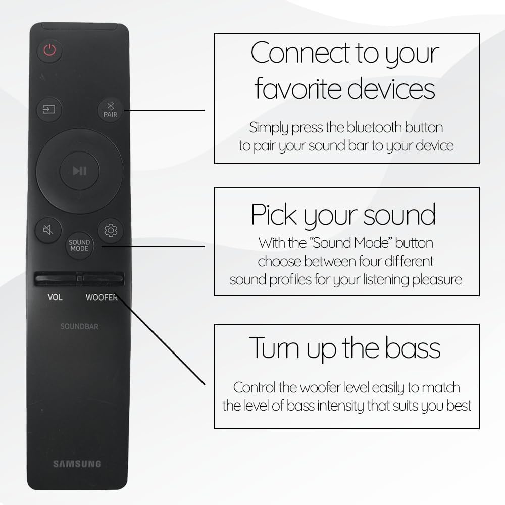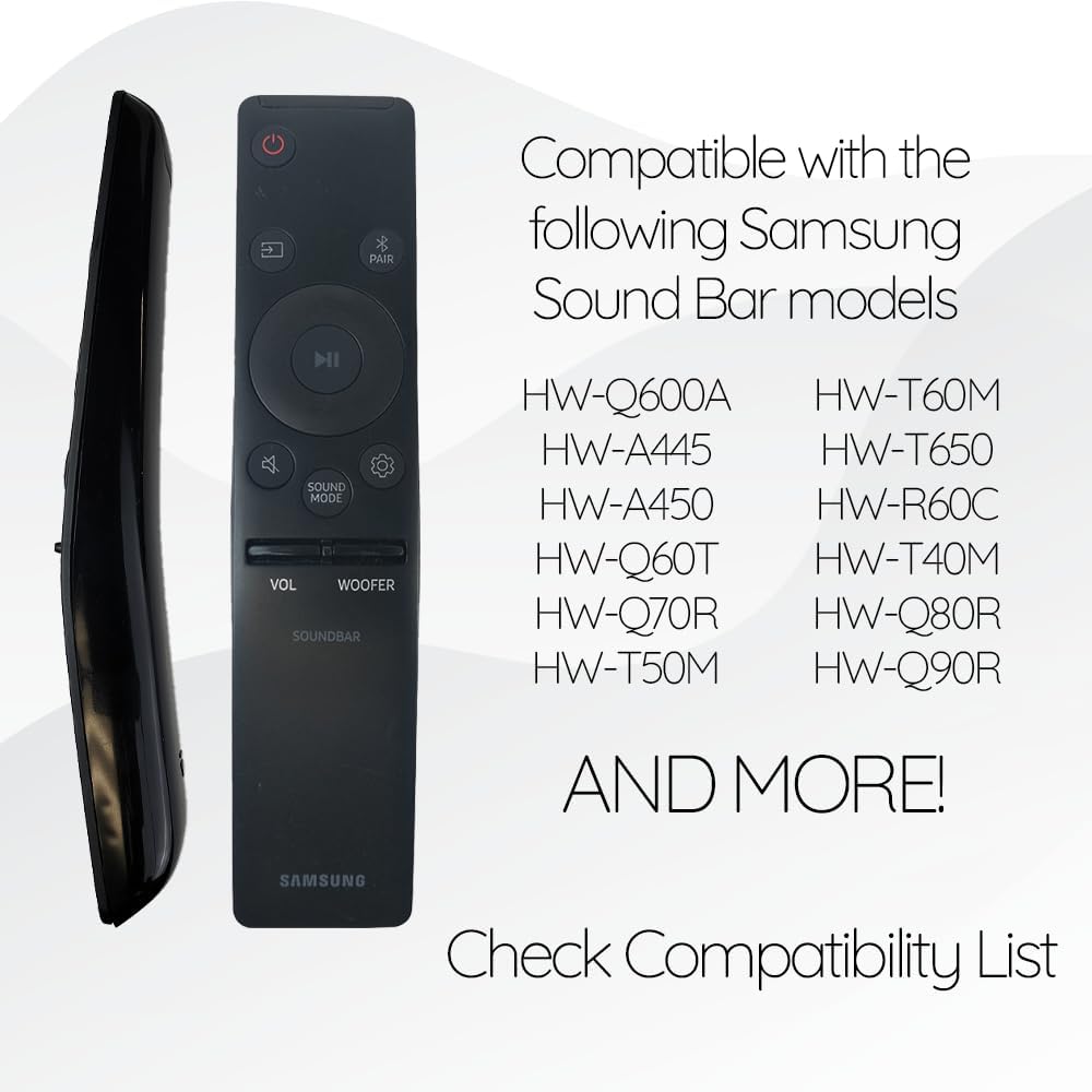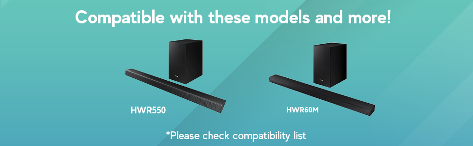 متوافق مع مجموعة واسعة من موديلات شريط الصوت من سامسونج 2018-2021، بما في ذلك HW-A40M، HW-A430، HW-A445، HW-A450، HW-A470، HW-A50M، HW-A550، HW-A60M، HW- A650، HW-Q600A، HW-Q65T، HW-Q700A، HW-Q800A، HW-Q900A، HW-Q950A، HW-T450، HW-Q60T، HW-Q70T، HW-Q800T، HW-Q900T، HW-T50M، HW-T550، HW-T60M، HW-T650، HW-Q950T، HW-S60T، HW-S61T، HW-T40M، HW-Q70R، HW-Q80R، HW-Q90R، HW-R450، HW-R550، HW- R60C، HW-R650، HW-N450، HW-N550، HW-N650، HW-N850، HW-N950 و HW-NW700.
