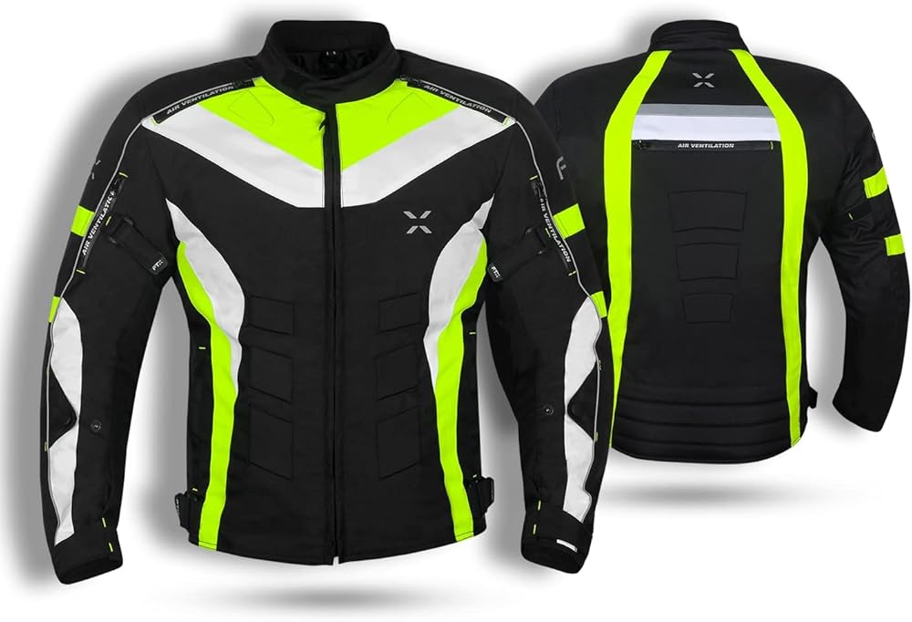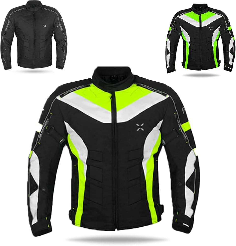 Presenting you the best quality 600D Cardura material jacket which is waterproof and benefits you more in rainy weather. It is wind resistant motorbike jacket with impermeable lining and unbelievable qualities. It is Eco-friendly, Durable, Comfortable and Soft. Available colors are Black, Black and Yellow, and Black and Green. Available sizes are XS for chest 46, S for chest 48", M for chest 52", L for chest 56", XL for chest 60", 2XL for chest 64", 3XL for chest 68" and 4XL for chest 72". Key Features: Air Ventilation system front and back motorbike jacket men.