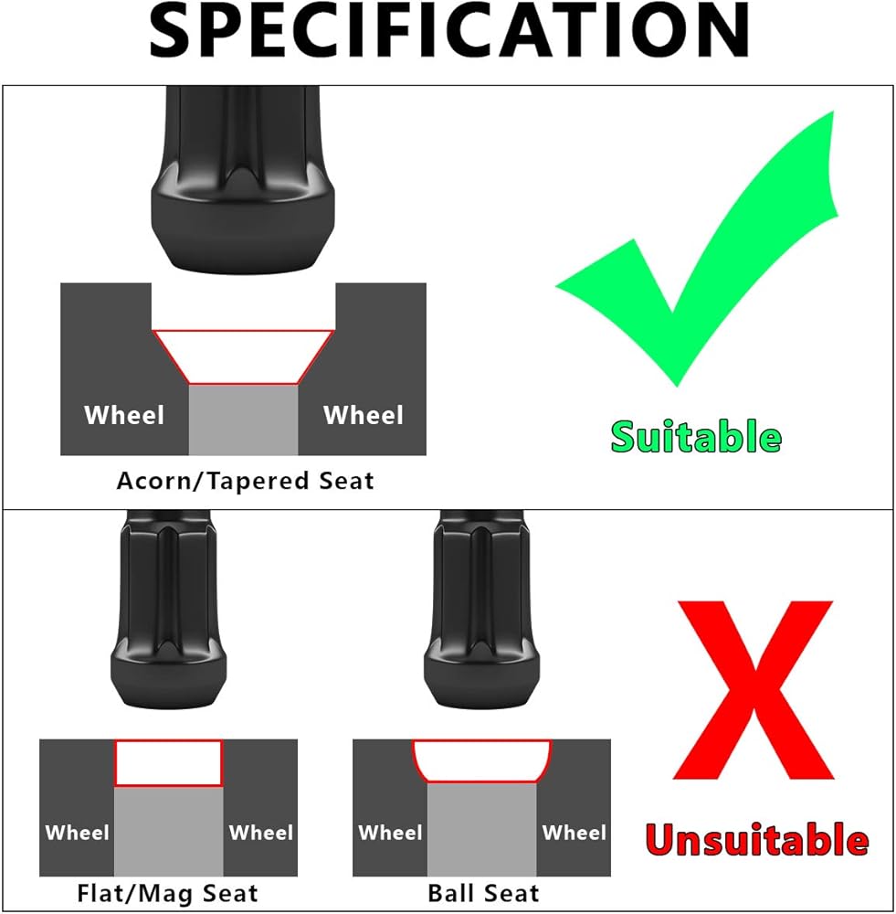 إكسسوار ممتاز للعجلات: تضمن الخيوط المصنعة بدقة تطابقًا مثاليًا مع مسامير العجلات في السيارة. قبل التثبيت، تأكد من أن المقعد ذو العروة وحجم الخيط وارتفاع مسامير العجلة الخاصة بك يتطابق مع هذه الصواميل.