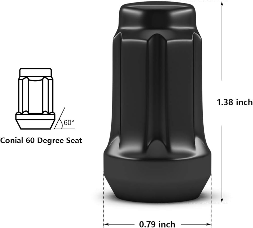 المواصفات: مقاس الخيط - M12x1.5، الارتفاع - 1.38 بوصة، مقاس سداسي - 3/4 بوصة، نوع المقعد - مقعد مخروطي 60 درجة، نهاية مغلقة. صواميل العروة السوداء 20 قطعة مع 1 قطعة مفتاح صامولة العروة.