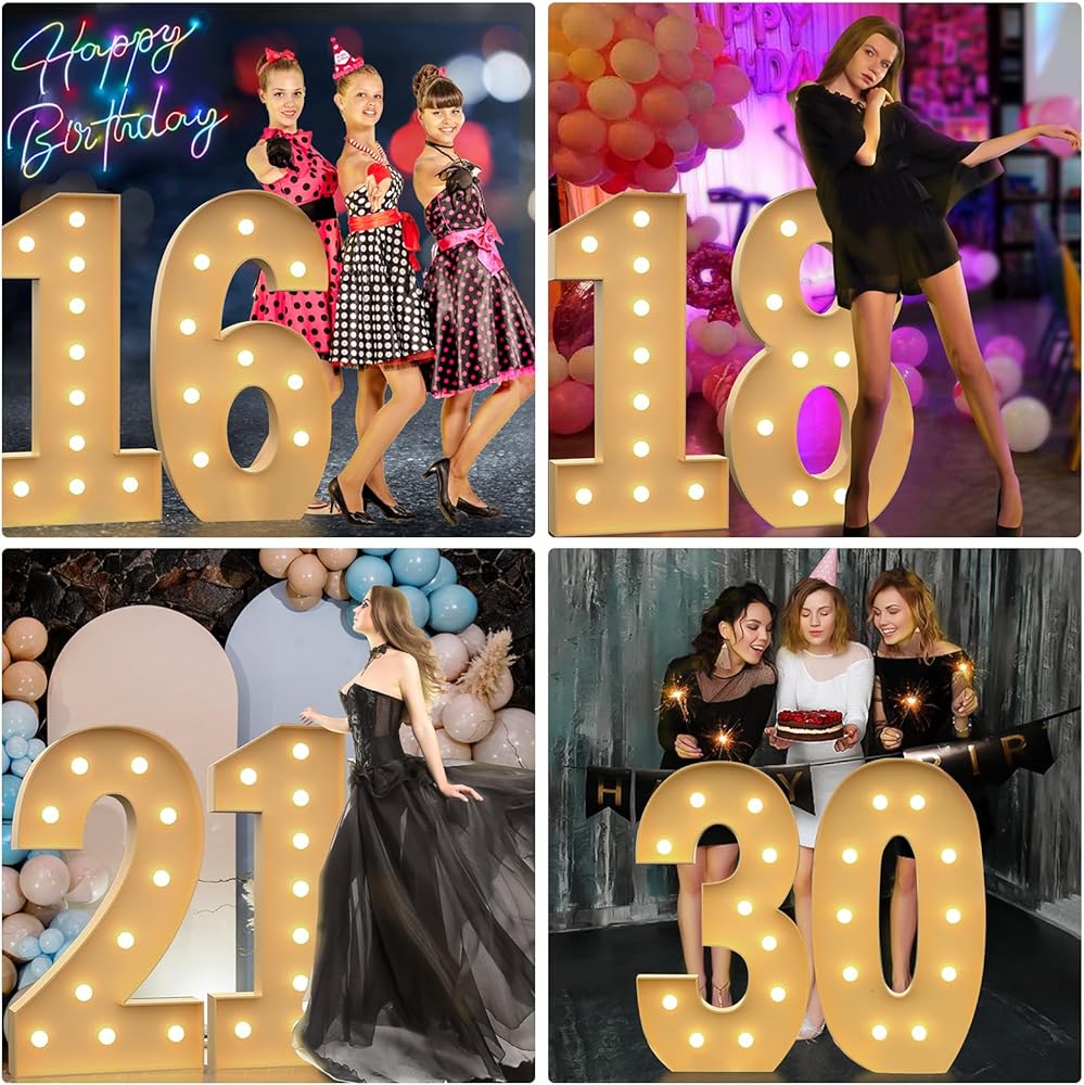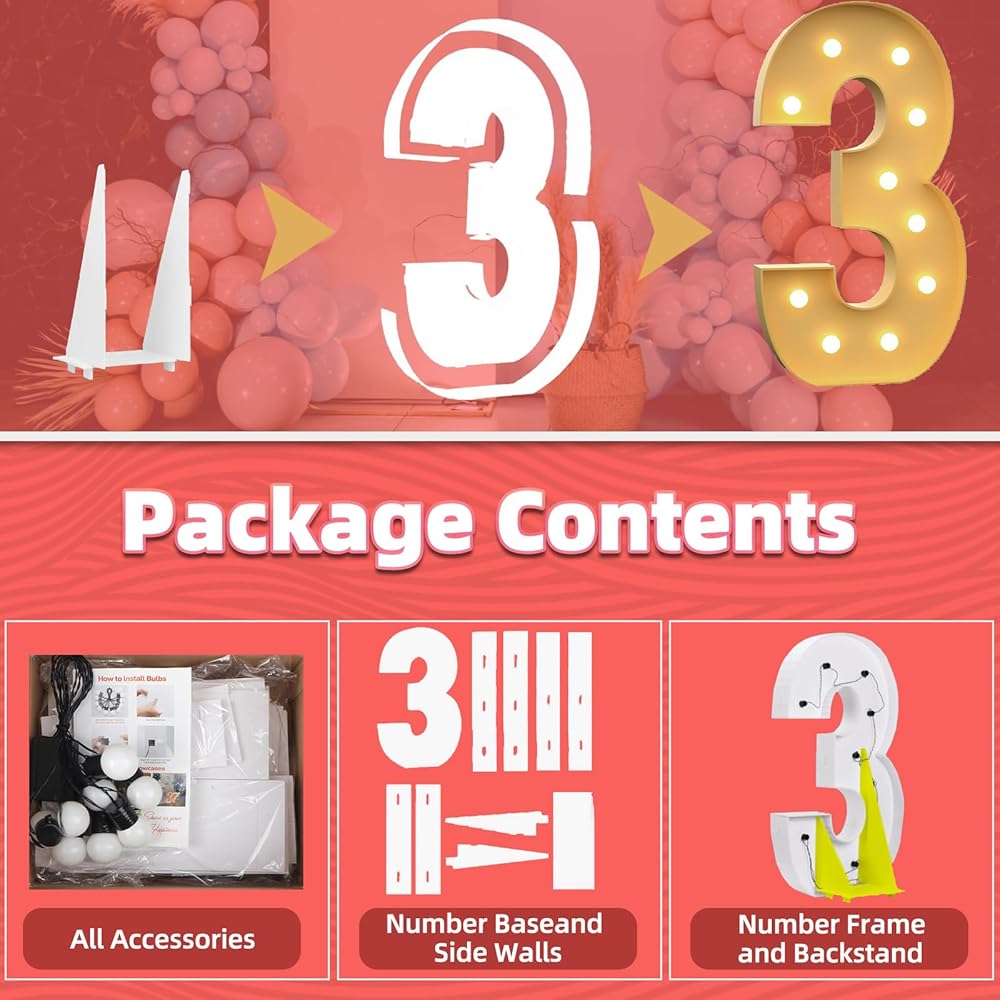 【تشمل العبوة】مجموعة من الحروف أو الأرقام المضيئة للحفلات، بما في ذلك إطارات الحروف المقطوعة مسبقًا، وسلاسل المصابيح الكهربائية، وتعليمات التجميع والملصقات البيضاء. تم تصميم الملصقات البيضاء خصيصًا لتغطية علامات الأرقام لجعل الديكور الخاص بك أكثر مثالية.