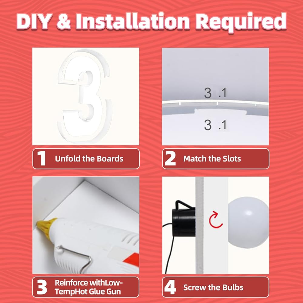 【سهلة التجميع】كل حرف ماركي عبارة عن إطار مقطوع مسبقًا بفتحات، 1) قم بمطابقة الفتحات الموجودة على اللوحة وتعزيز كل اتصال بالغراء الساخن. 2) قم بربط المصباح باللوحة وقم بتركيب 3 بطاريات AAA. (ملاحظة: مسدس الغراء والبطاريات غير متضمنة)