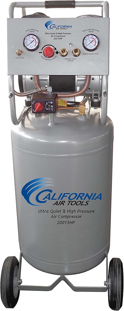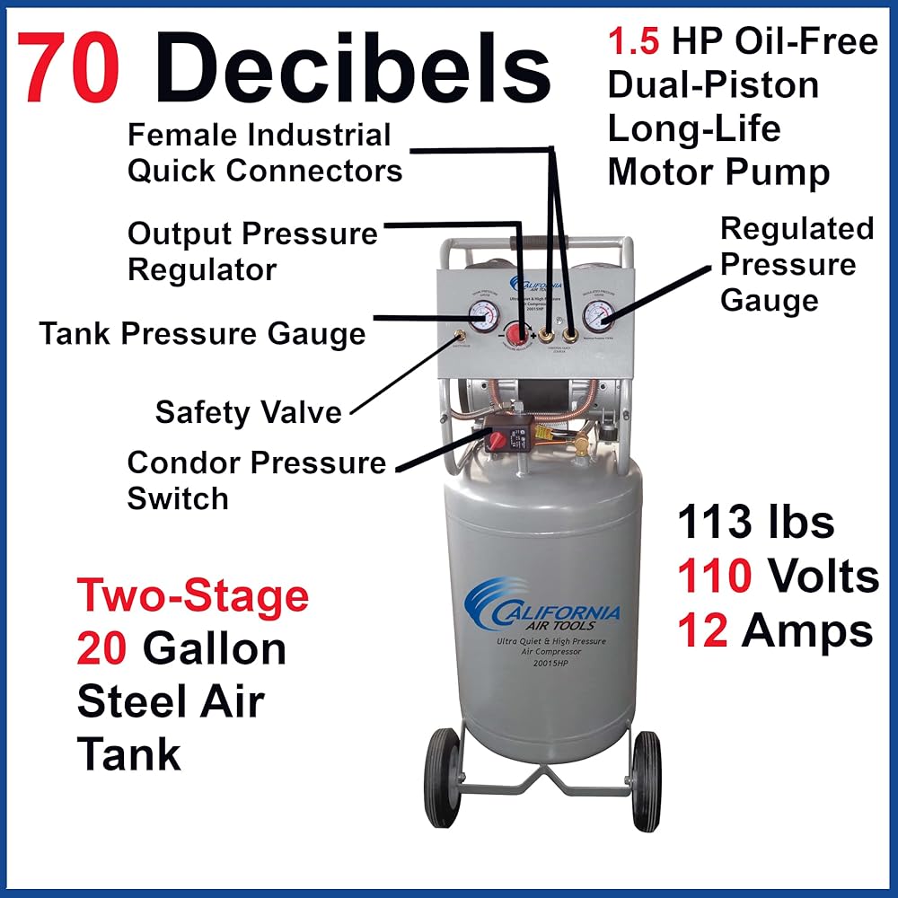 The CALIFORNIA AIR TOOLS 20015HP Ultra Quiet, Oil-Free and High Pressure Two-Stage Air Compressor is designed to be one of the quietest 1.5 Hp air compressors in the industry having only 70 decibels of sound. This high pressure 1.5 HP motor operates at only 1750 RPM creating less noise and less wear. This motor has been designed to increase duty cycle and allow for longer continuous run times. The Oil-Free Two-Stage Dual Piston Pump System is engineered for high performance and durability. The CAT-20015HP Air Compressor has a Oil-Free Dual Piston pump designed to have a life cycle before wear of 3000 Plus hours. The Oil-Free pump allows for use in a variety of temperatures (cold starts) and uneven terrains (no oil in the pump). The Easy Start Valve feature allows for a easier start up using less starting amps. The Easy Start Valve releases a small amount of air from the pump at start up to produce a no-load condition allowing the motor to spin freely. This no-load start up requires less amps for a easier start up in cold temperatures. The large 20 Gallon Steel Air Tank with wheel kit makes it very easy to move around the jobsite, shop or garage. Designed for the person looking for High Pressure, High Air Flow, Less Service and Maintenance with at Least 30% Less Noise!.