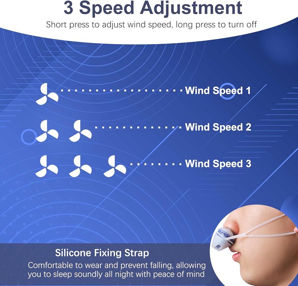 Personalized Comfort: With its adjustable wind speeds, this stop snoring sleep aid device is designed to accommodate various needs, ensuring optimal airflow and oxygen content through the nasal cavity. The fixed strap prevents the device from falling off during sleep, offering a secure and comfortable fit for uninterrupted rest