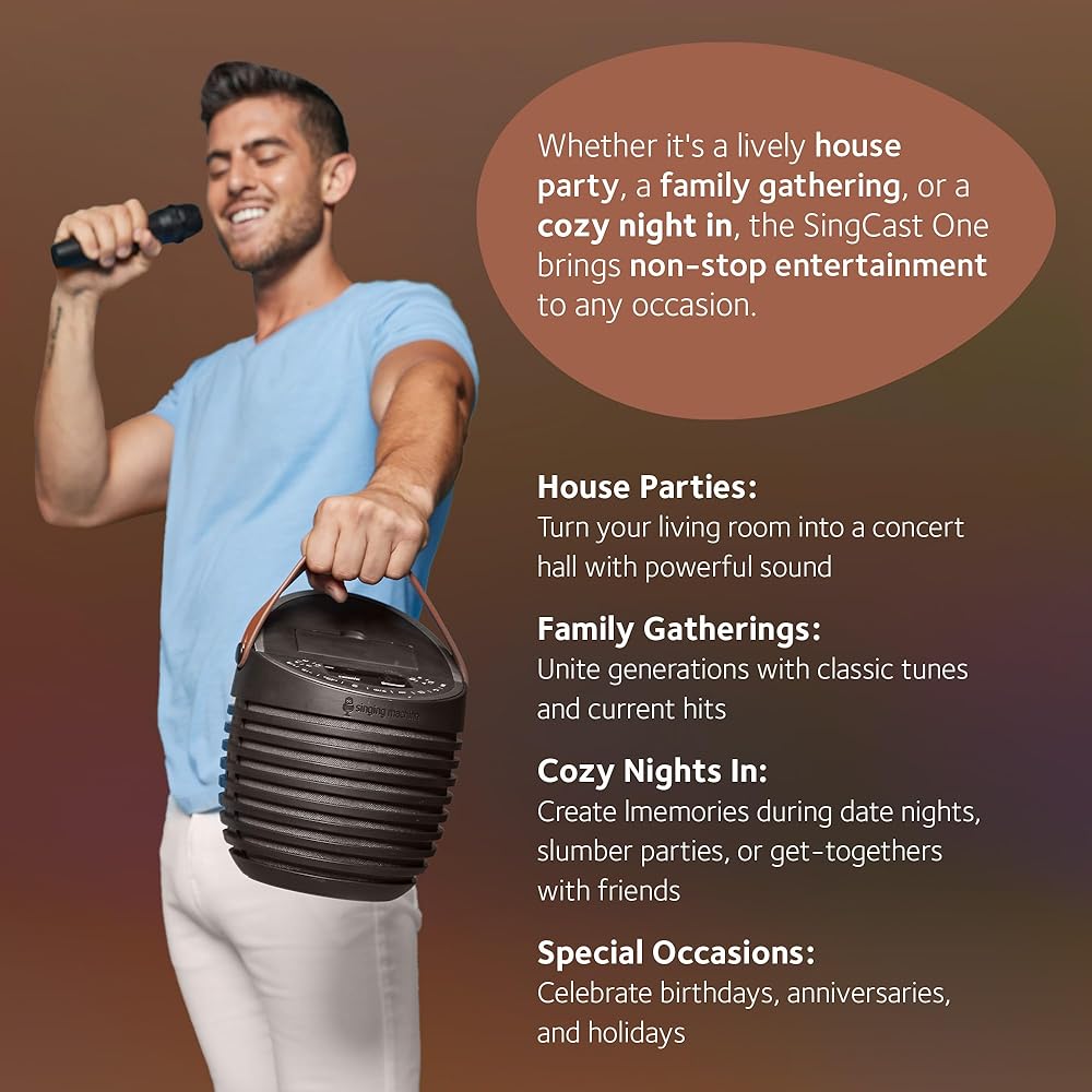 • تجربة الكاريوكي المثالية: ارفع مستوى ليالي الكاريوكي الخاصة بك مع نظام SingCast One Karaoke (SMC2020) المزود بتقنية Bluetooth. إن قدرتها على بث الفيديو وسهولة الاتصال ومصابيح LED والتحكم في تأثير الصدى ستأخذ جلسات الغناء الخاصة بك إلى المستوى التالي.