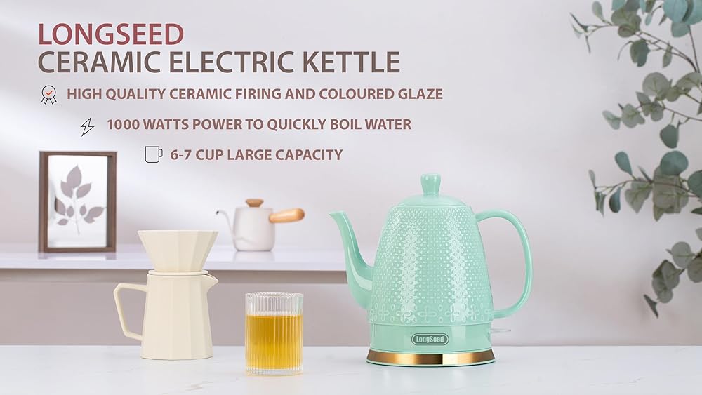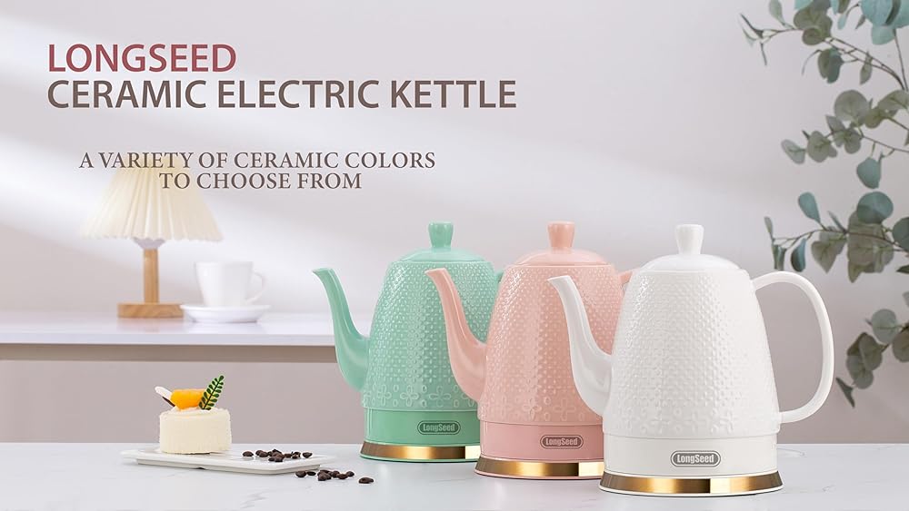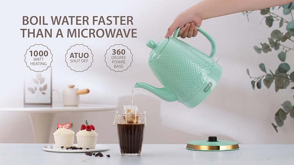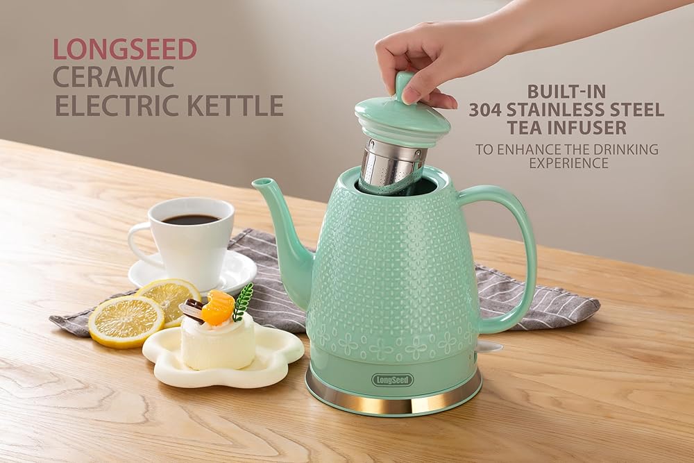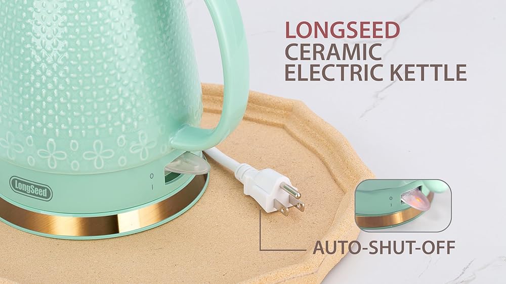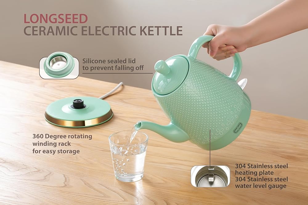 • 【USER-FRIENDLY BASE】The ceramic electric kettle features a 360-degree rotating and detachable power base, providing convenience and ease of use. The beveled edge of the base, coupled with a metal stainless steel trim, adds a touch of sophistication to the design while ensuring stability and durability during operation.
