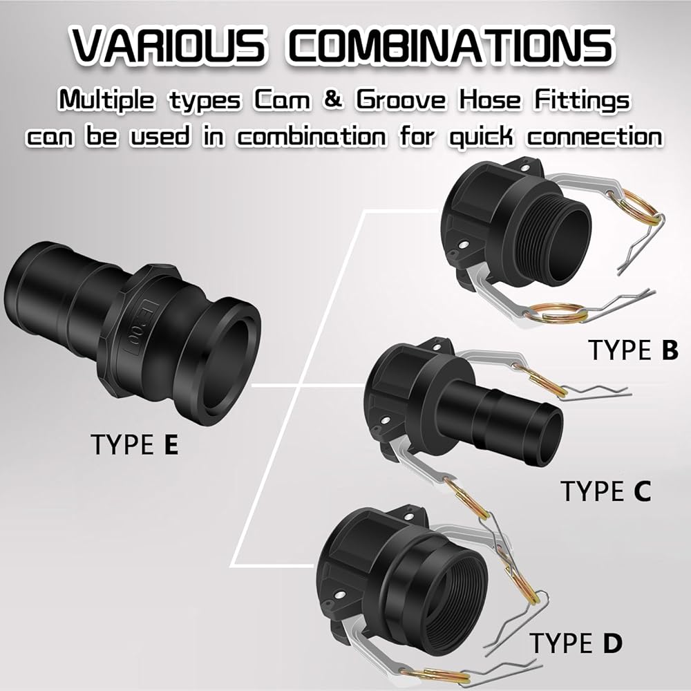 سهولة الاتصال: يمكن لمحول قفل الكاميرا من النوع E التعامل مع الضغوط التي تصل إلى 150 رطل لكل بوصة مربعة، وسيتصل الجانب الذكر من هذا المحول فقط بقفل كاموك أنثى مقاس 2 بوصة. تحذير: لا ينبغي خلط الكاميرا والأخدود من مادة البولي بروبيلين مع التركيبات المعدنية. نوصي بذلك استخدام مادة البولي بروبيلين مع تركيبات Camlock الأخرى من البوليستر والبلاستيك والبولي فينيل كلوريد والبانجو.