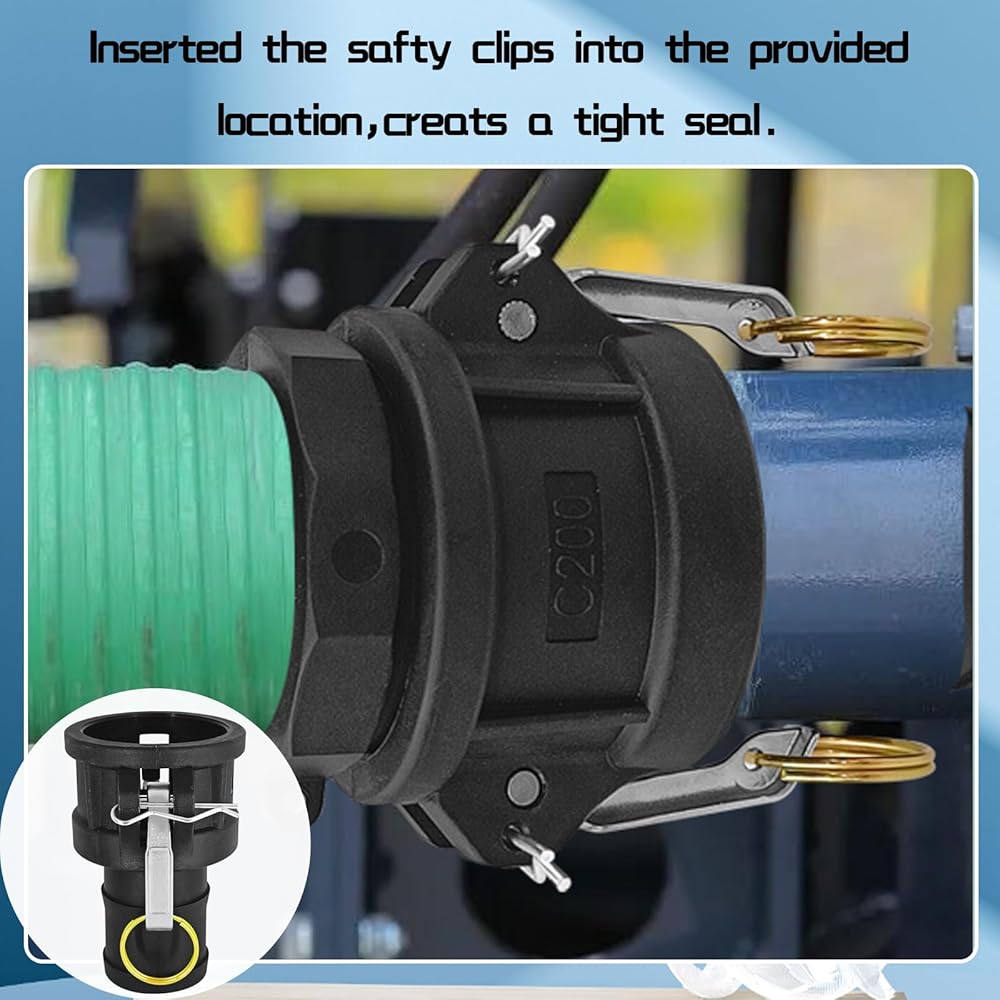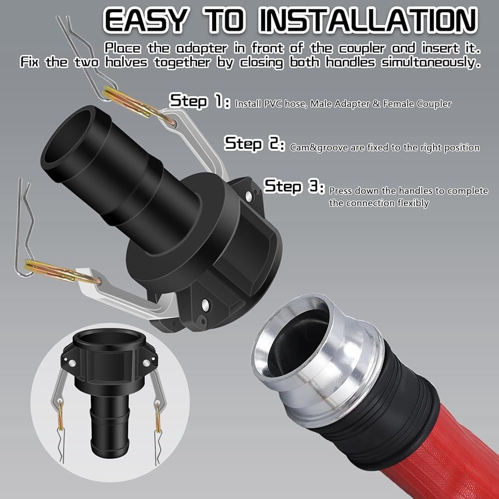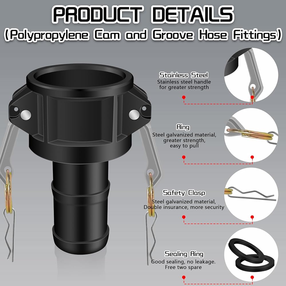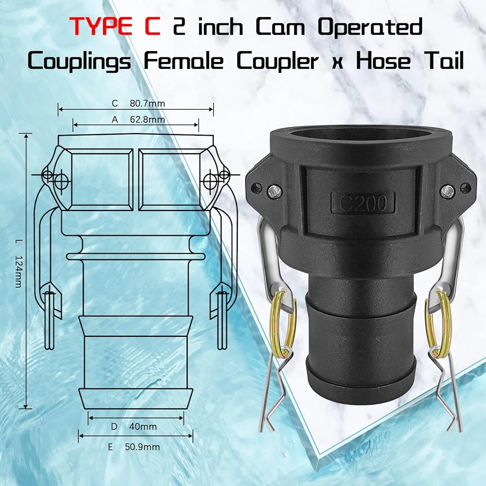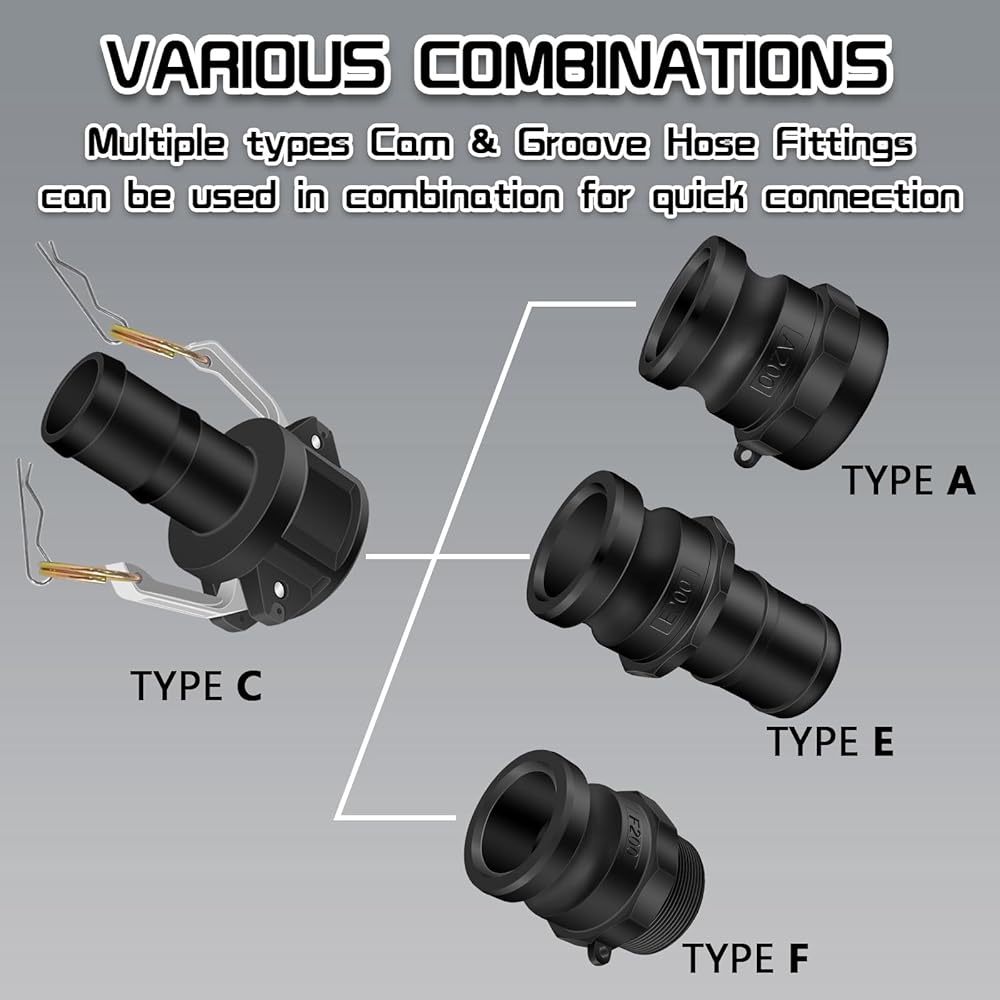 سهولة الاتصال: يمكن لمحول قفل الكاميرا من النوع E التعامل مع الضغوط التي تصل إلى 150 رطل لكل بوصة مربعة، والجانب الأنثوي من هذا المحول سيتصل فقط بقفل ذكر 2 بوصة. تحذير: لا ينبغي خلط الكاميرا والأخدود من البولي بروبيلين مع التركيبات المعدنية. نوصي بذلك استخدام مادة البولي بروبيلين مع أنواع أخرى من البوليستر والبلاستيك والبولي فينيل كلوريد والبانجو