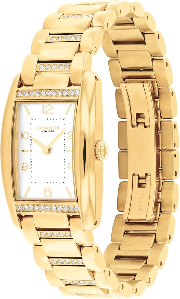 With a distinctive stately design, the minimalist Reese watch is an elevated choice for every day. Sparkling with crystals, this gold-tone bracelet design features a white satin dial detailed with a mix of numerical and stick markers. It's accented with the iconic Coach Signature on the clasp for a heritage touch.