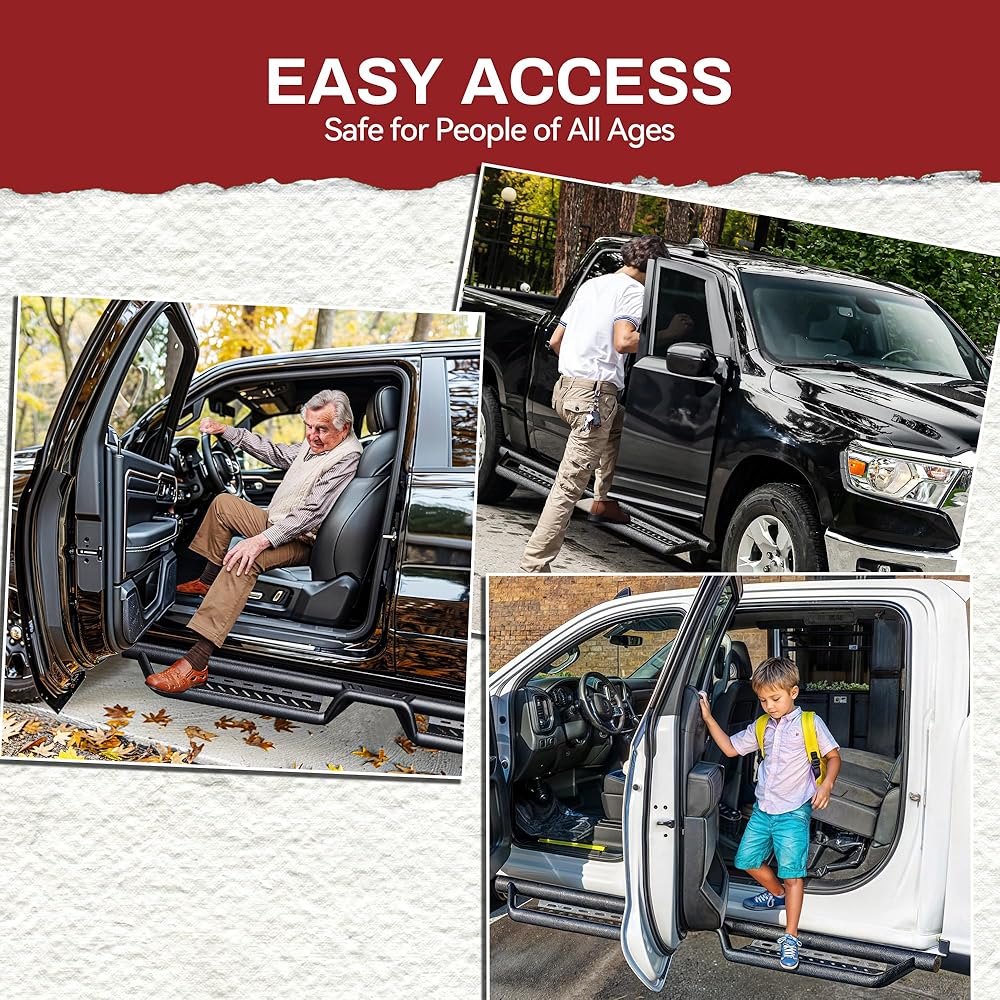 YITAMOTOR running boards merge extra-long drop steps with a rugged texture finish to achieve a distinct off-road look; The 3D pattern on 4.7-inch step pads provides stable footing and minimal slippage, while also providing space to wipe off your boots.