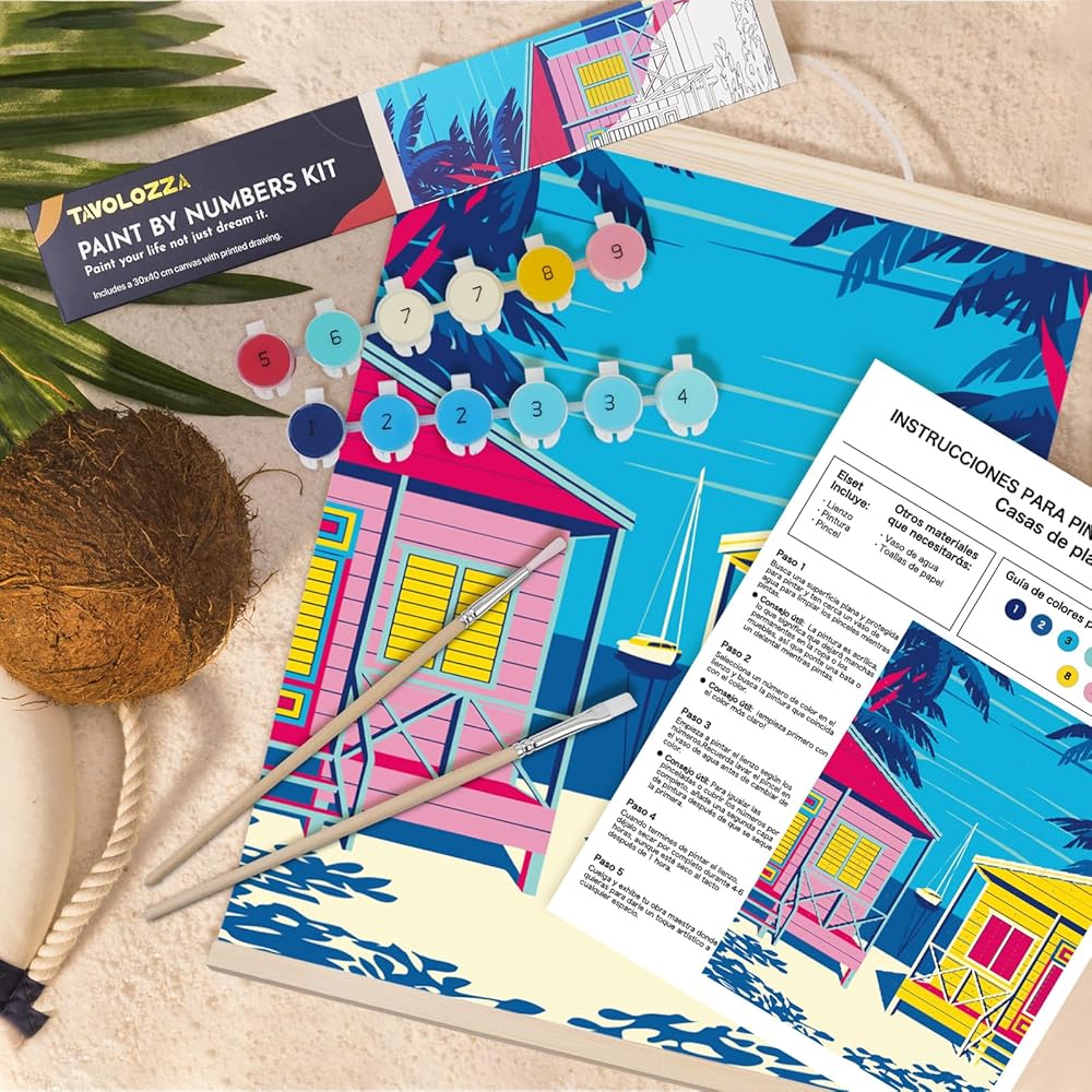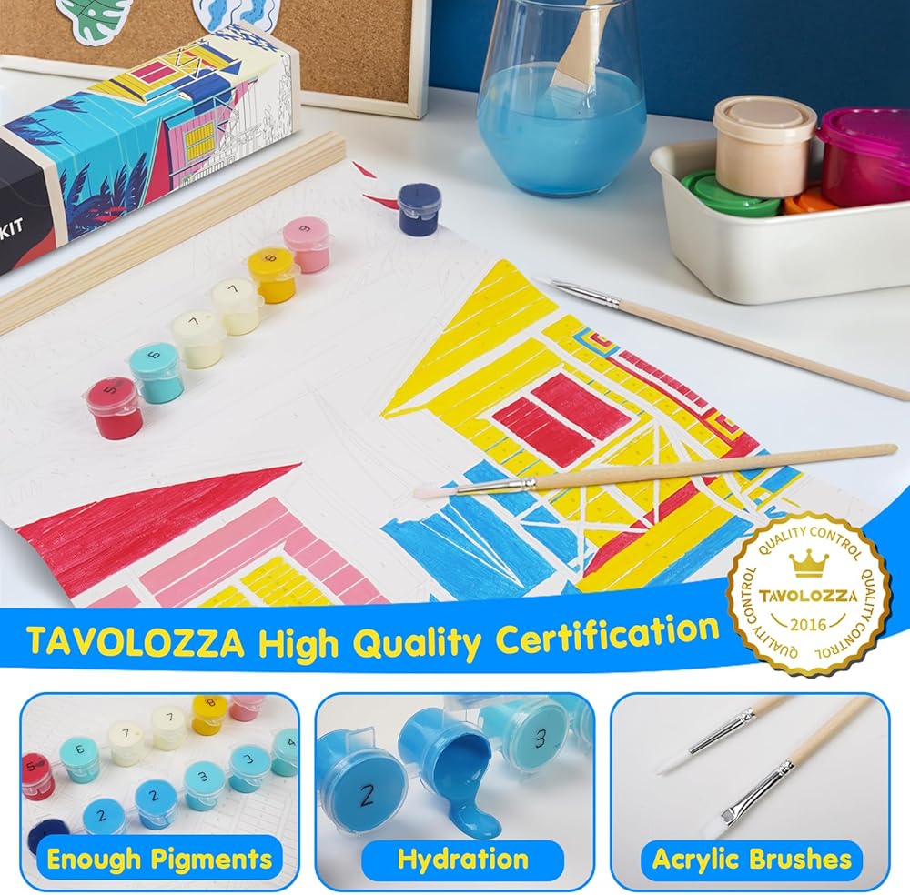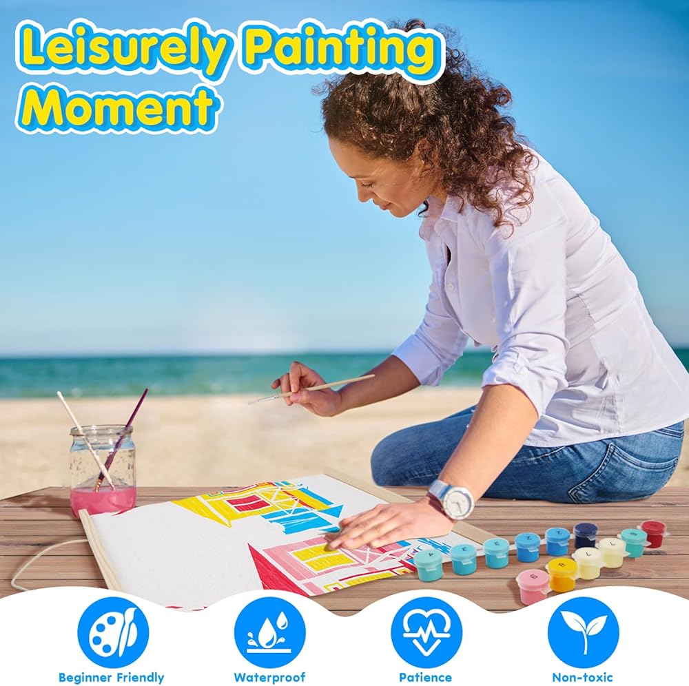 طلاء TAVTAVOLOZZA بالأرقام للبالغين والمبتدئين والأطفال، مجموعة طلاء منازل الشاطئ مقاس 12 × 16 بوصة، مجموعة طلاء أكريليك DIY مع إطار خشبي، وحبل قطني قابل للتعليق وفرش