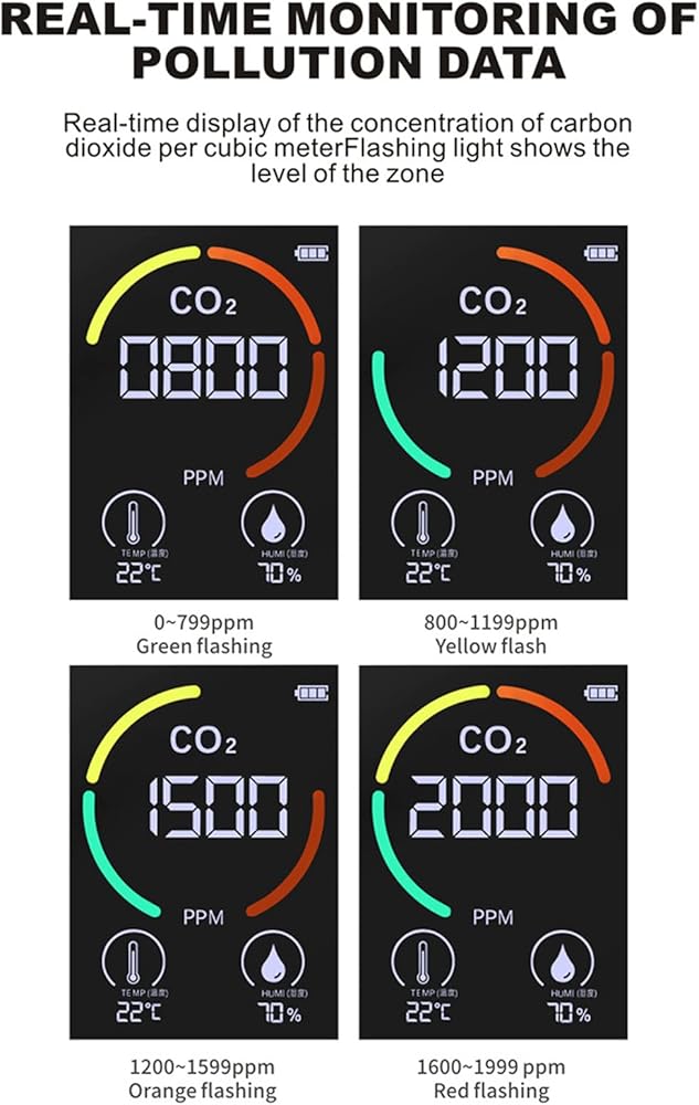 Real Time Monitor: The carbon dioxide monitor can detect the concentration of carbon dioxide in the air in real time, and four warning lights flash at the same time when it is above 1999.