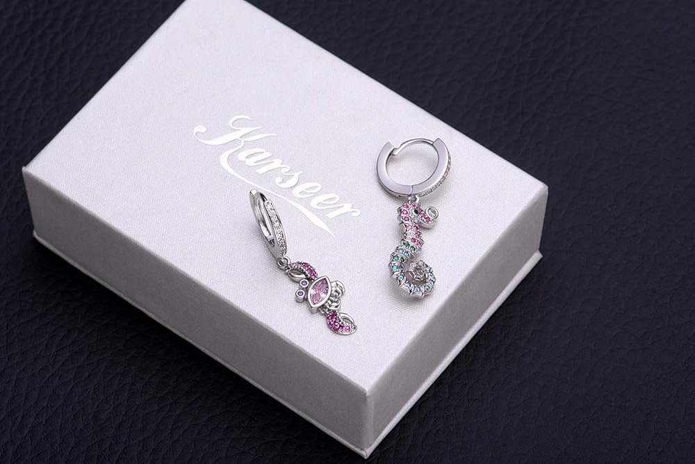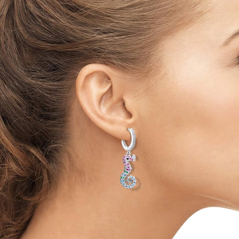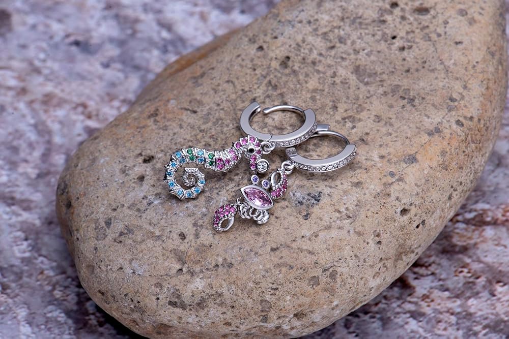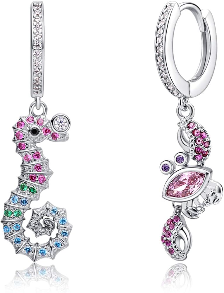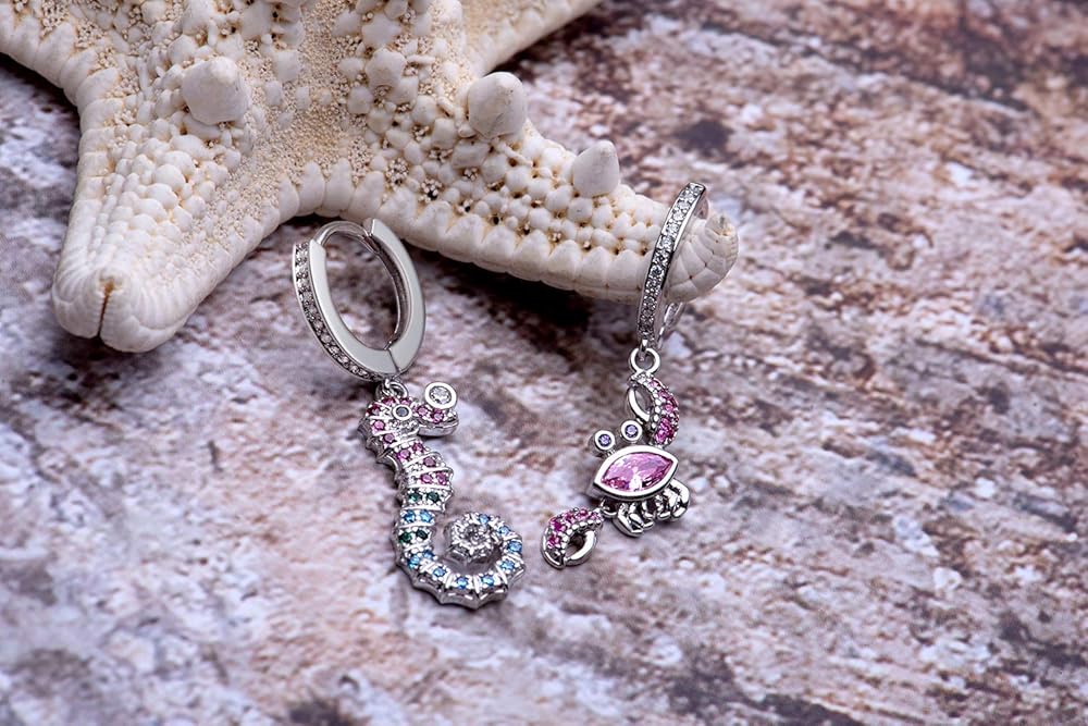 These ocean and beach style hoop earrings will give you a great mood. When you put them on and close your eyes, you can smell the sun, the sea and the beach! Choose your favorite theme -- asymmetrical seahorses and crabs, or symmetrical starfish. These earrings are covered in shiny colored zircon crystals, Pave crystals that are solid and don't fall off, and they make you look more attractive. Because of their small size, they look very light and stylish and are suitable for everyday wear, they look great for women or young girls.