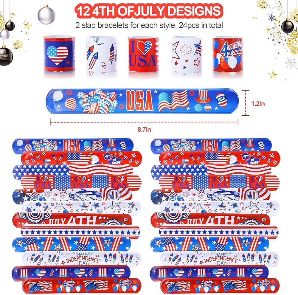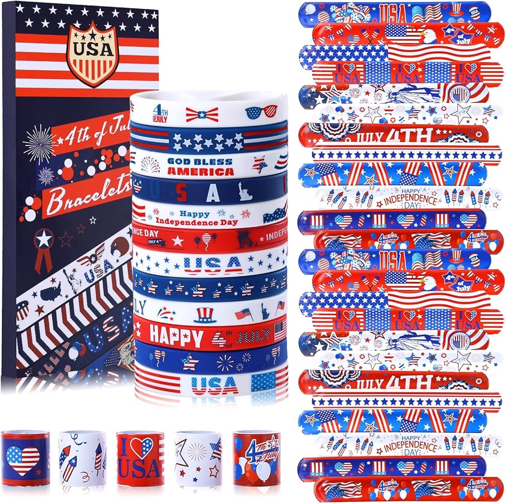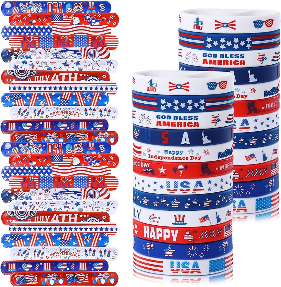 Package includes:the package comes with 24 pieces of American flag rubber bracelets and 24 pieces patriotic slap bracelets, include various colors and American flag pattern, stars and more, enough style and quantity to meet the needs of your game party