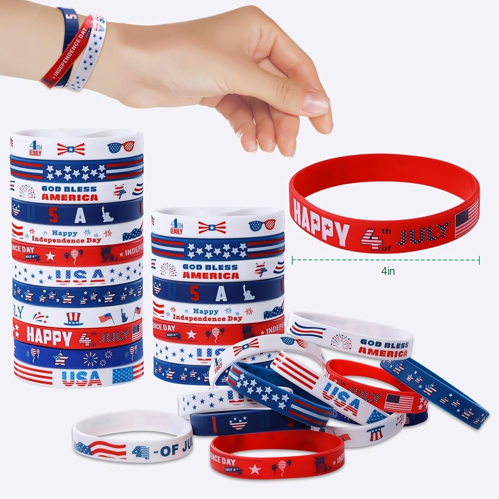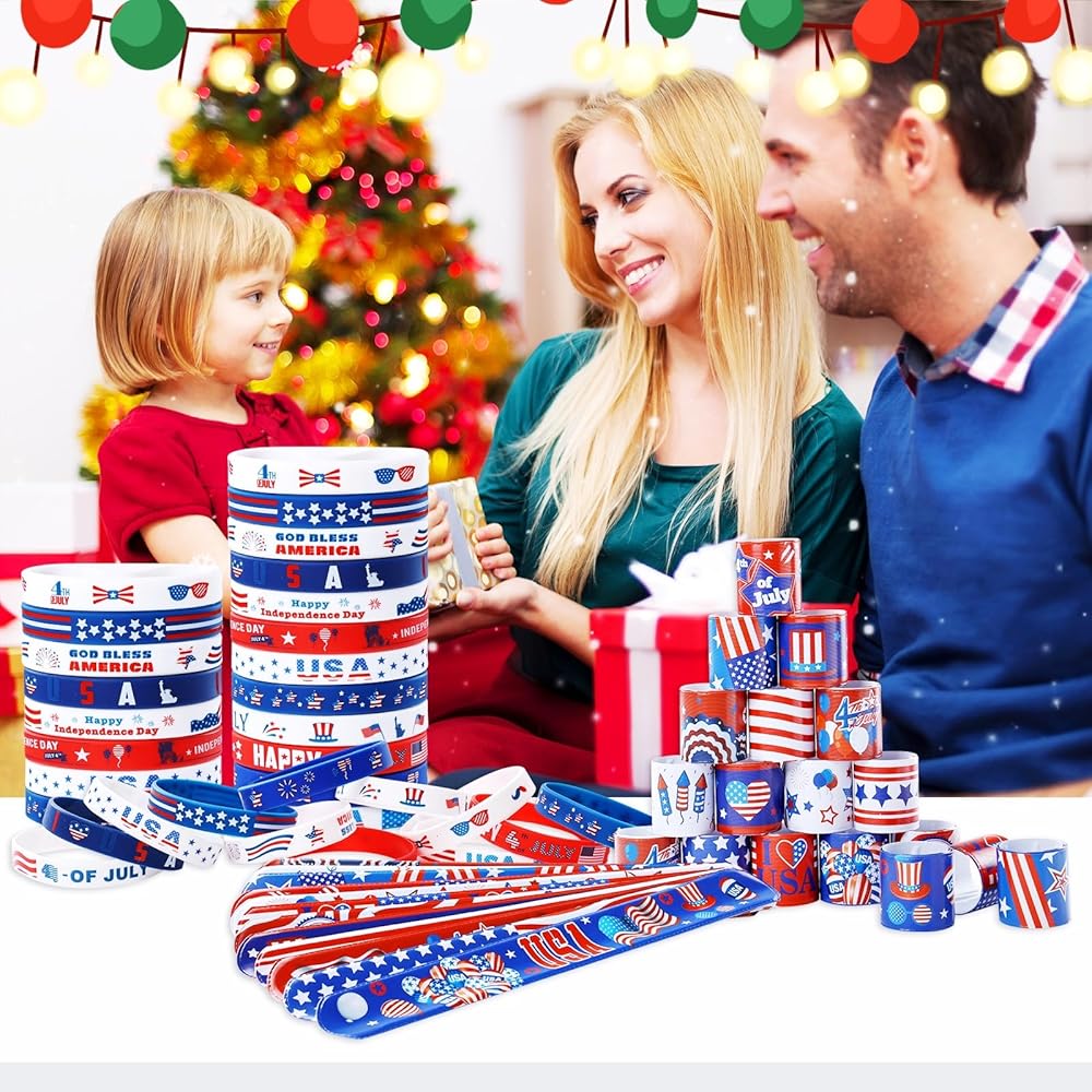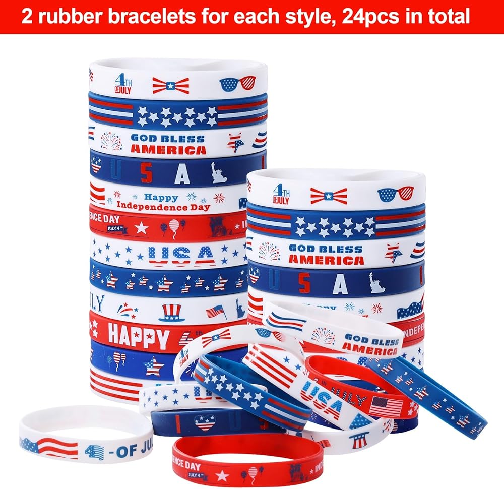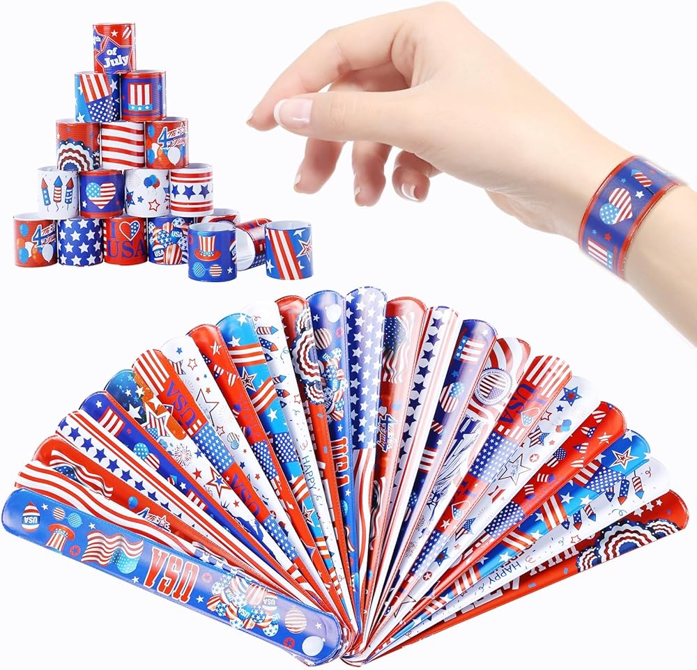 Package includes:the package comes with 24 pieces of American flag rubber bracelets and 24 pieces patriotic slap bracelets, include various colors and American flag pattern, stars and more, enough style and quantity to meet the needs of your game party