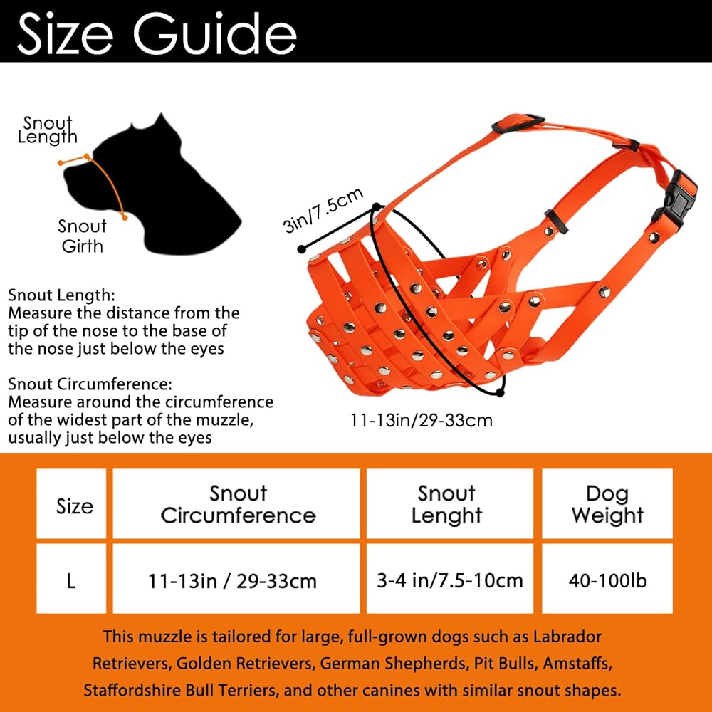 الحجم والسلالات - تم تصميم كمامة الكلاب الكبيرة للسلالات الكبيرة التي يبلغ محيط خطمها 11-13 بوصة وطول خطمها 3-4 بوصات. كمامات الكلاب ذات السلالات الكبيرة مناسبة لسلالات مثل لابرادور ريتريفر، وجولدن ريتريفر، وكلب الراعي الألماني، وبيت بولز، وأمستافس، وستافوردشاير تيريرز، وغيرها من الأنياب الكبيرة ذات أشكال الخطم المشابهة.
