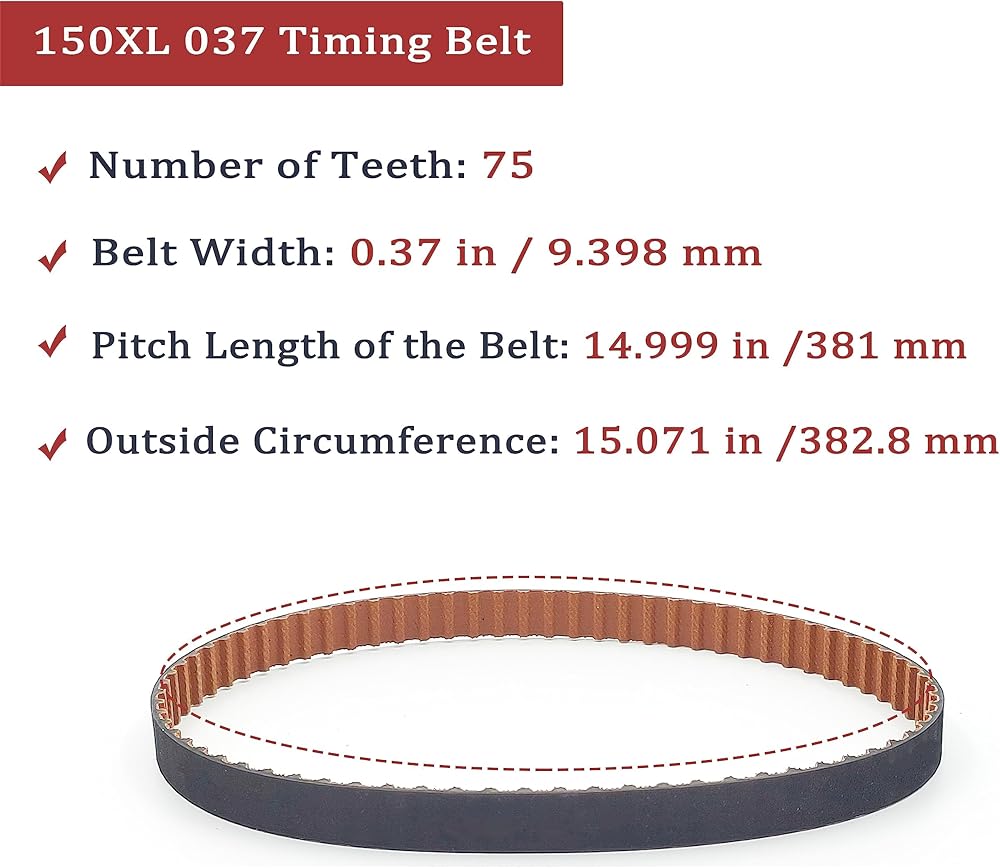 ❤ Package Includes: 2 pcs of 150XL 037 timing belts. Outside Circumference of the Belt: 15.071 in /382.8mm; Pitch Length of the Belt: 14.999 in /381mm; Belt Width: 0.37 in / 9.398 mm; Number of Teeth: 75.