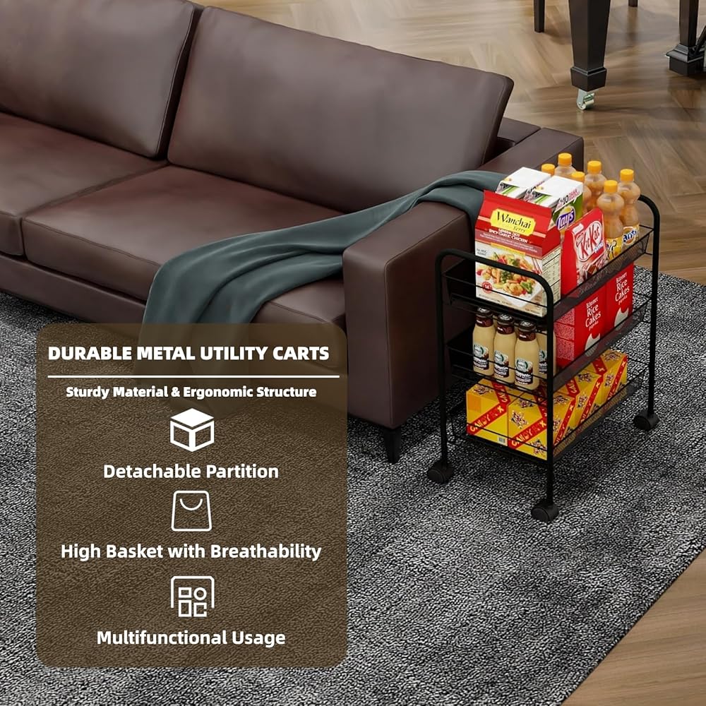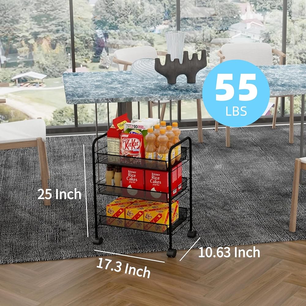 عربة دوارة كبيرة جدًا مكونة من 3 طبقات - فسيحة ومتينة وسهلة التجميع، عربة أدوات معدنية واسعة مع أرفف شبكية، تدعم ما يصل إلى 55 رطلاً، 4 خطافات، مثالية للمطبخ والحمام والمزيد - أسود أنيق