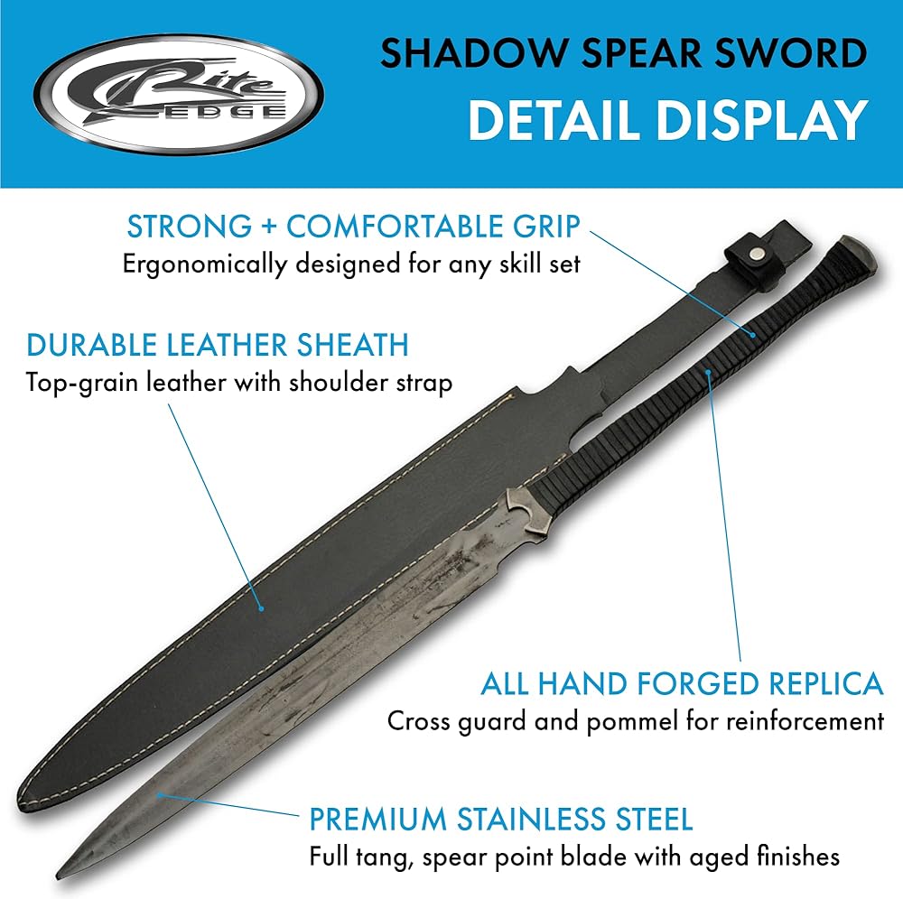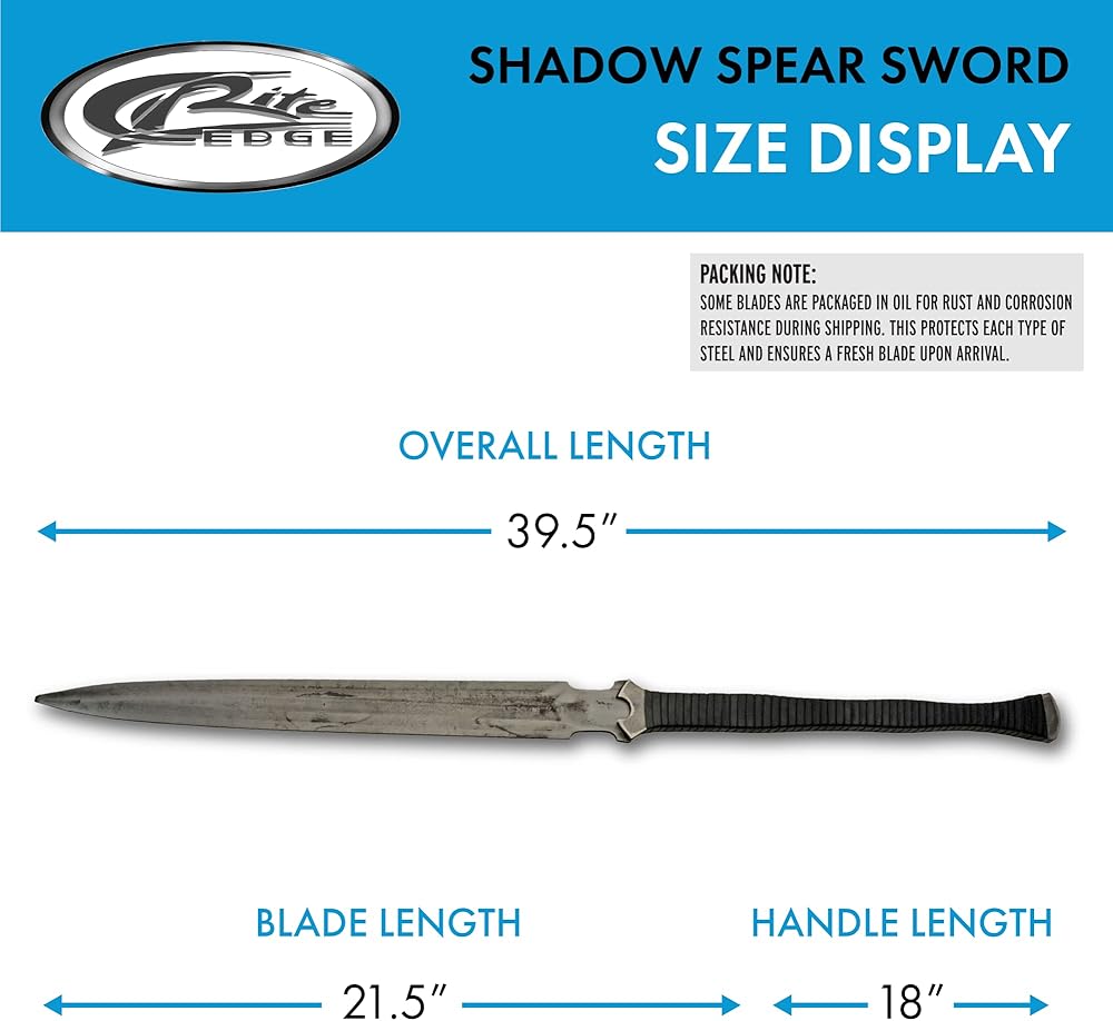 Dimensions: 39.5 inches in overall length with an 18-inch handle. 21.5 inches in blade length, 2.25-inch width (at its widest point) and 6mm thickness. Built Tough: Made from premium quality stainless steel this full tang, doble edged, spear point medieval sword is sure to last the long haul, treated for optimal edge retention and resistance to rust and corrosion. Handling: The solid steel handle with cross guard and pommel on this replica sword is all hand forged like the blade and leather wrapped for a high-friction grip and is expertly balanced for a comfortable and slip resistant grip. Sheath: Accompanied with this battle sword is an authentic top-grain leather sheath with a shoulder strap and belt loop for a variety of wearable styles and quick, save and convenient on-the-go storage. Application: This collector's blade is ideal for all of your LARP, Cosplay, medieval, Historical or renaissance events and makes a wonderful addition to any sword enthusiast. Blade comes with a false edge but can easily be sharpened.