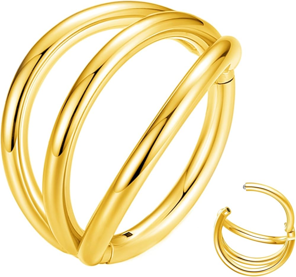 Simple style triple hoop look hinged clicker ring. This piece is suitable for multiple piercings such as Nose Piercing,Nostril Piercing,Septum Piercings,Ear Piercings (Cartilage, Conch, Daith, Helix, Rook, Snug, Tragus),Facial Piercings.