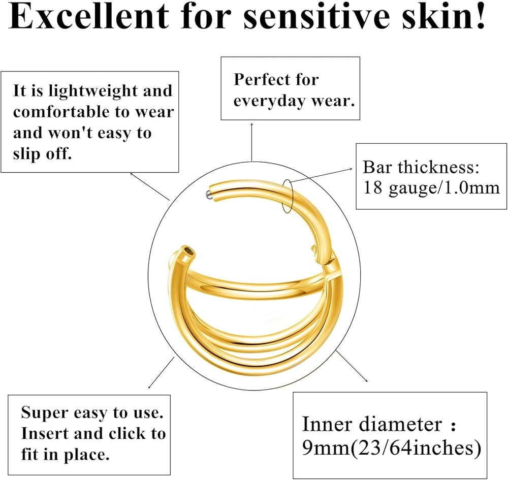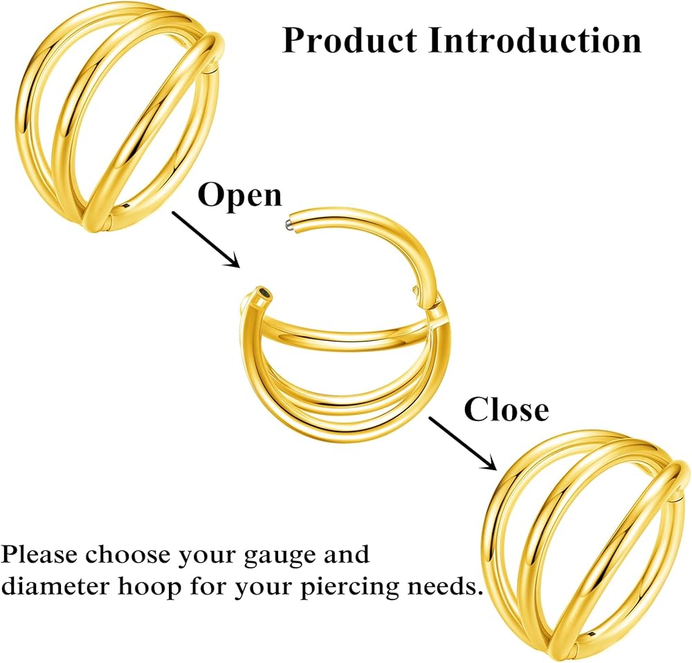 Easy To Use: It is easy to insert by hand without a tool. The closure is seamless. And it's still tight after long-term use, needn't to worry about lost when working, walking or exercising. Suitable for Triple Hoop Segment Rings/Cartilage Hoop/Seamless Hinged Clicker/Helix/Conch/Tragus/Rook/Earlobe/Nose Hoop/Nose Ring/Ear Piercings/Nipple Rings.