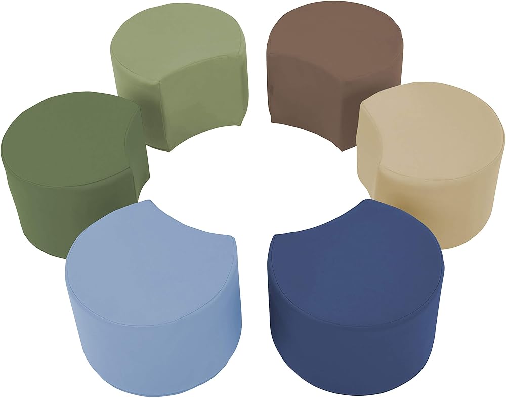 Circle up in style with SoftScape Crescent Seating Set! This multi-piece set features six soft foam crescent-shaped seats and one taller oval seat for an adult. The set is great for circling up for story time or group activities in classrooms, daycares, preschools and homes. When not in use, the seats nestle around oval stool to create an attractive flower-like arrangement. The soft, colorful polyurethane materials are durable and easy to maintain—just wipe clean with mild soap and water solution. Non-slip base keeps seats in place when in use.