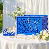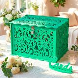 مقاس كبير جدًا: يبلغ مقاس صناديق بطاقات الزفاف للاستقبال 12.2 × 9.2 × 8.5 انش، لافتة البطاقة 5.5 انش × 2.7 انش. كبيرة بما يكفي لحمل أكثر من 300 بطاقة أو مظروف، يمكنك أيضًا وضع المال أو البطاقات البريدية أو الهدايا الصغيرة بالداخل. نقدم مفاتيح وأقفال قوية ولطيفة للحفاظ على بطاقاتك وهداياك آمنة.