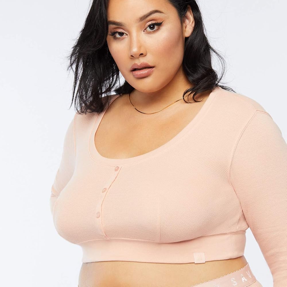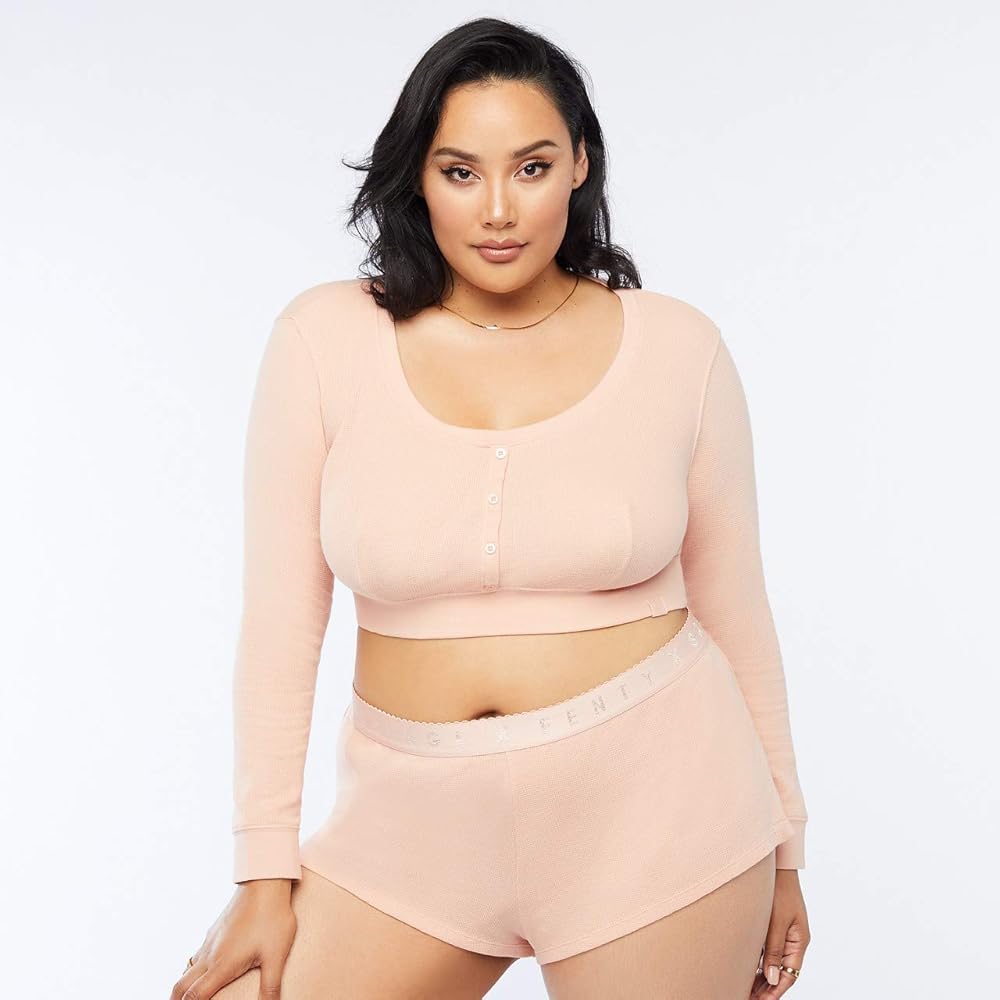 Our Savage X thermal crop top features a scoop neck and logo buttons.