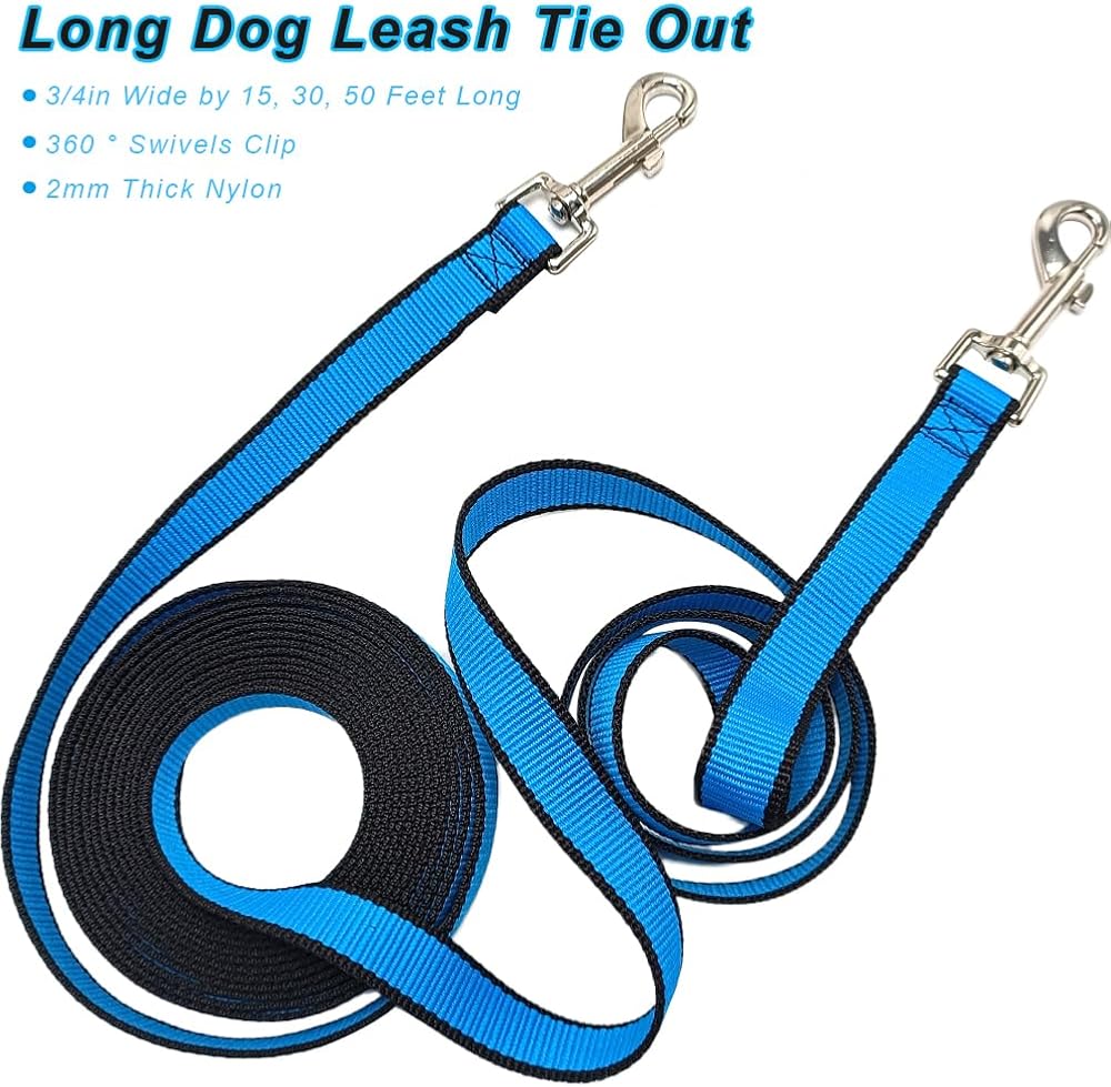 • الأبعاد - يبلغ مقاس المقود الخارجي هذا 3/4 بوصة عرضًا و15 قدمًا و30 قدمًا و50 قدمًا طولاً. رائعة للمشي لمسافات طويلة والتخييم والتدريب والصيد والفناء الخلفي والشاطئ والتدريب على الاستدعاء واللعب في الهواء الطلق بكرات التنس والسباحة!