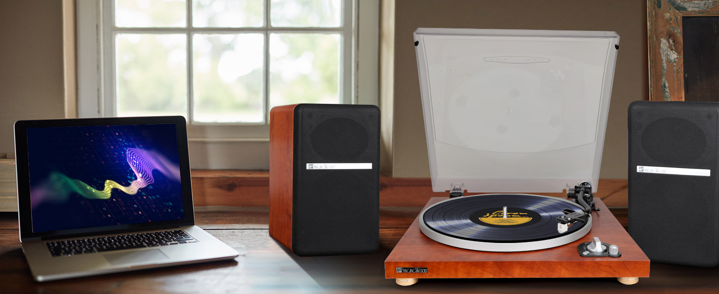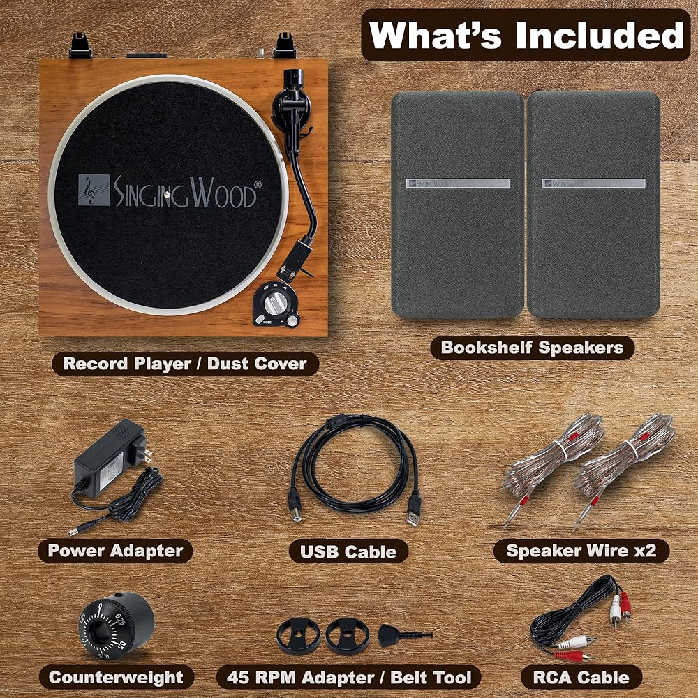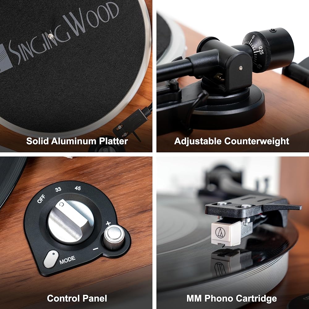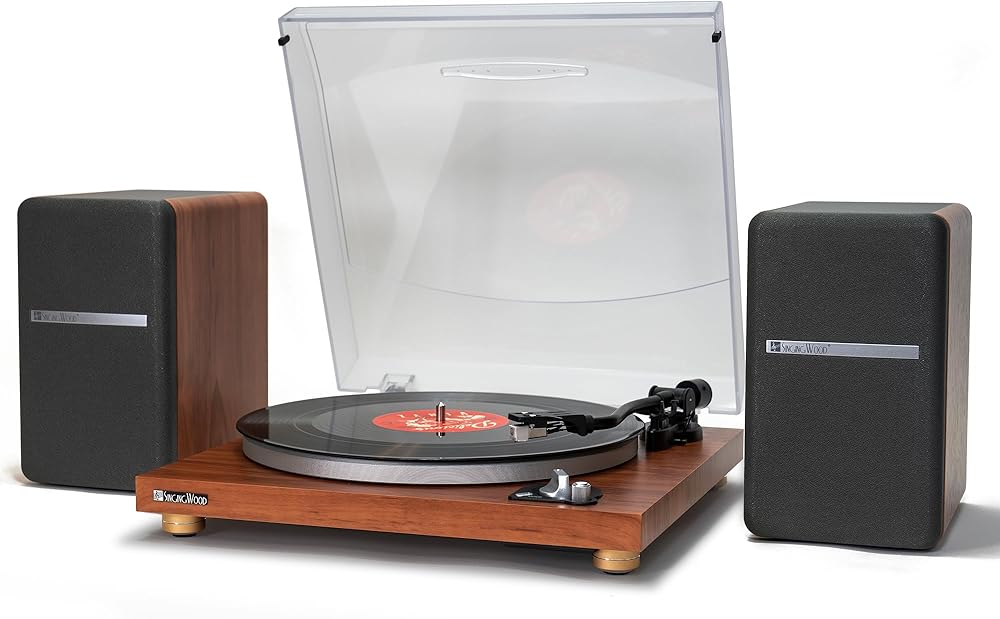 محرك حزام بلوتوث SingingWood VP42AS مزود بسرعتين مدمجتين في قرص دوار Preamp Hi-Fi مع مكبرات صوت على رف الكتب بقدرة 44 وات، ومشغل تسجيلات الفينيل مع تشغيل بلوتوث بخرطوشة مغناطيسية (جوز)