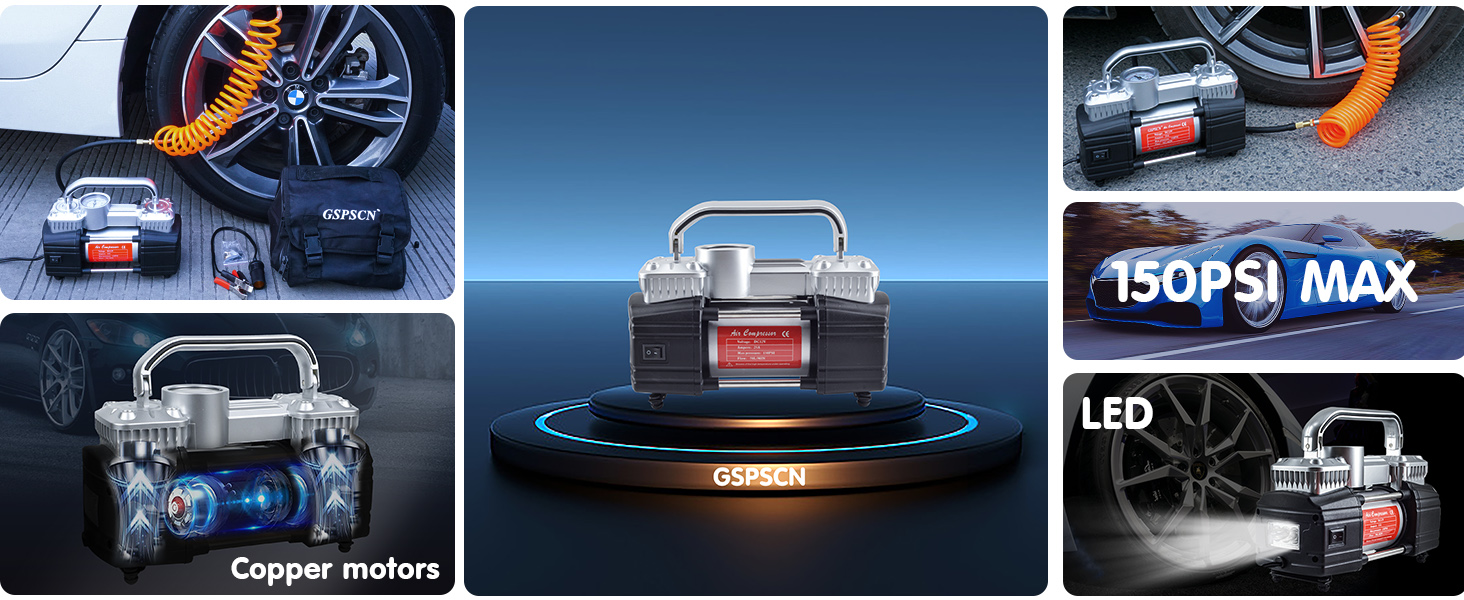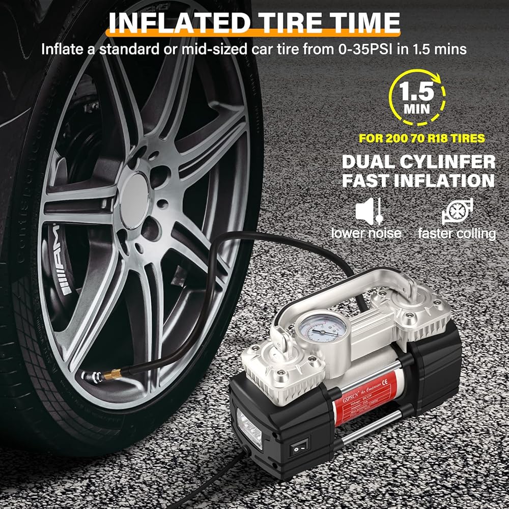 【أسطوانة مزدوجة】: تصميم أسطوانة مزدوجة GSPSCN عالي التحمل، أقصى ضغط 150 رطل لكل بوصة مربعة، تدفق الهواء 70 لتر/الدقيقة، ينفخ إطار السيارة القياسي في دقيقتين (200/70/R18، 0-40 رطل لكل بوصة مربعة)