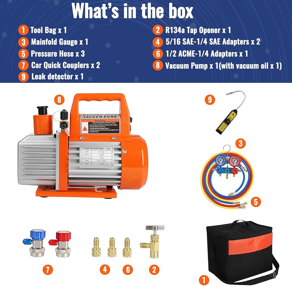 【Comprehensive Package】: This kit includes 1 single-stage vacuum pump, 1 bottle of vacuum oil and a gauge set, all packed in a handy carry bag. It's the ideal solution for automotive air conditioning, HVAC work, and other industrial requirements needing a high vacuum pull from a compact pump.