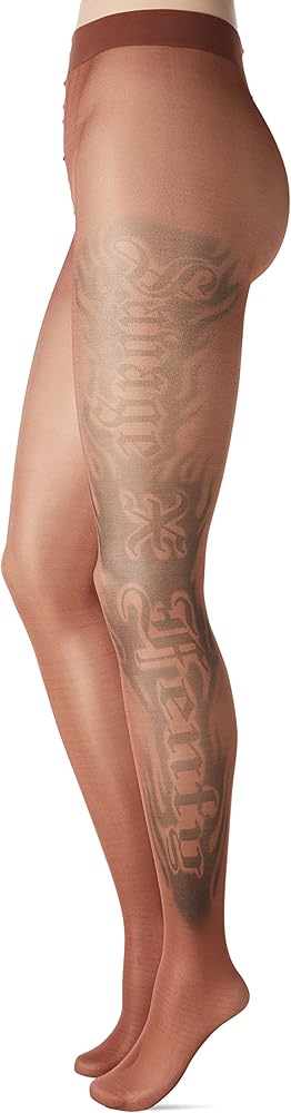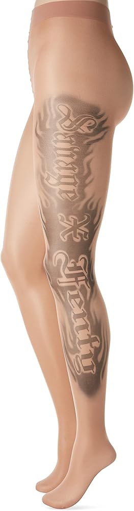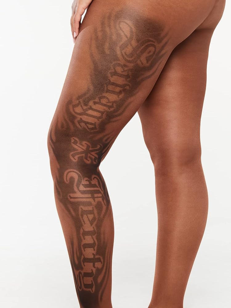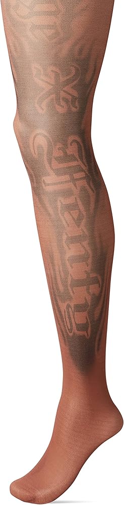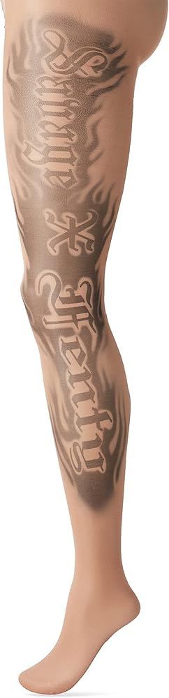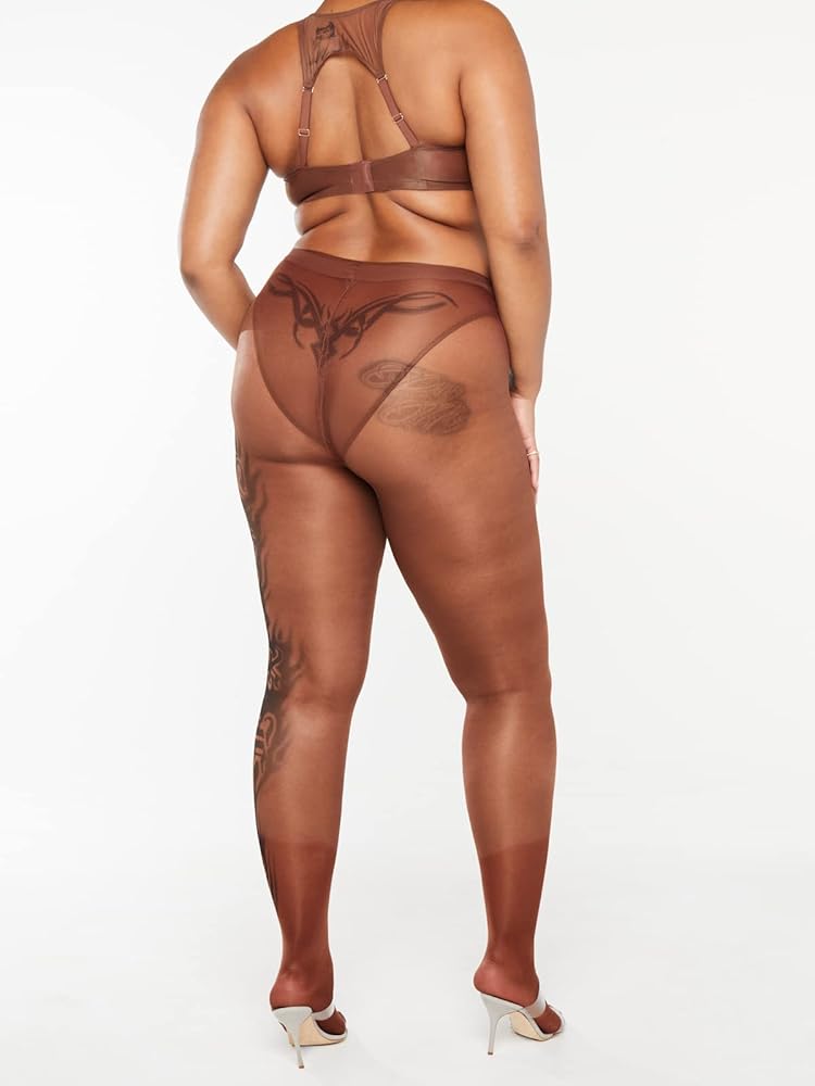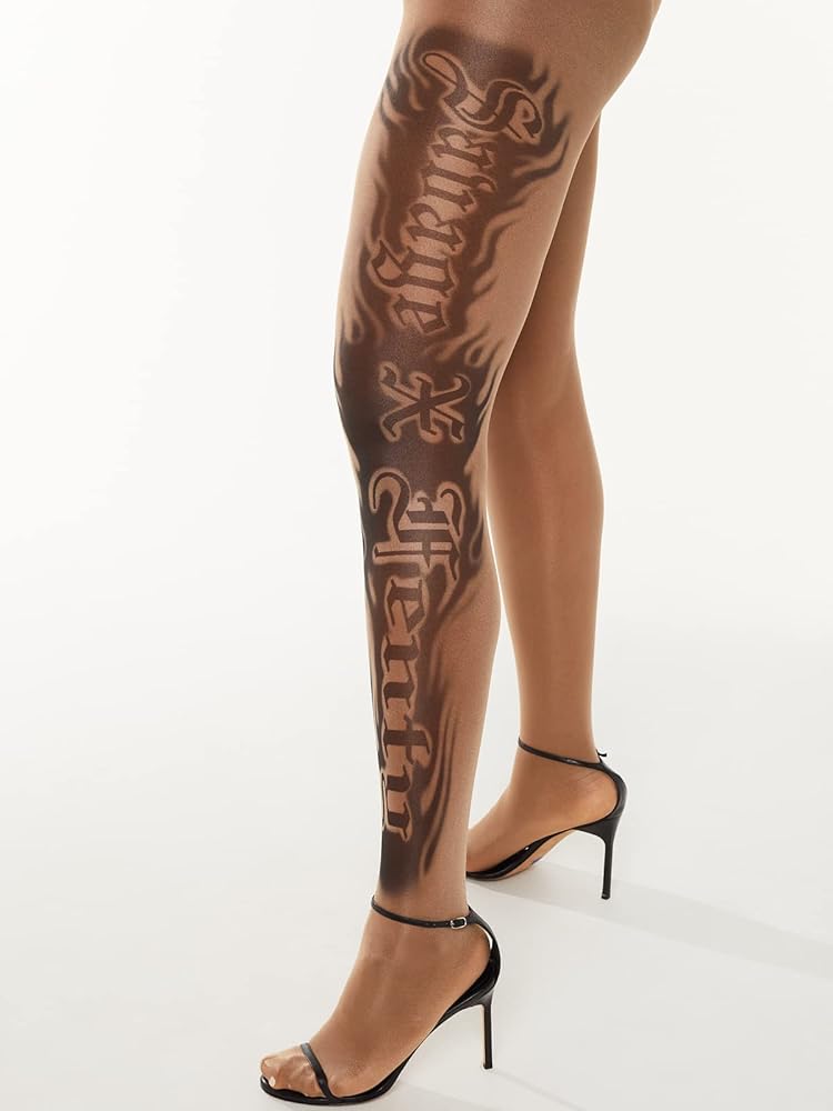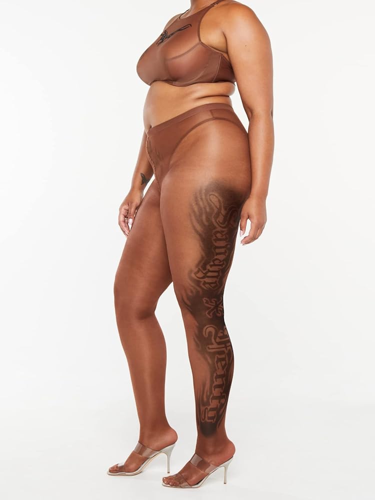 • Sheer tights with tattoo graphics designed and placed by collaborating artist Maneula Soto Sosa