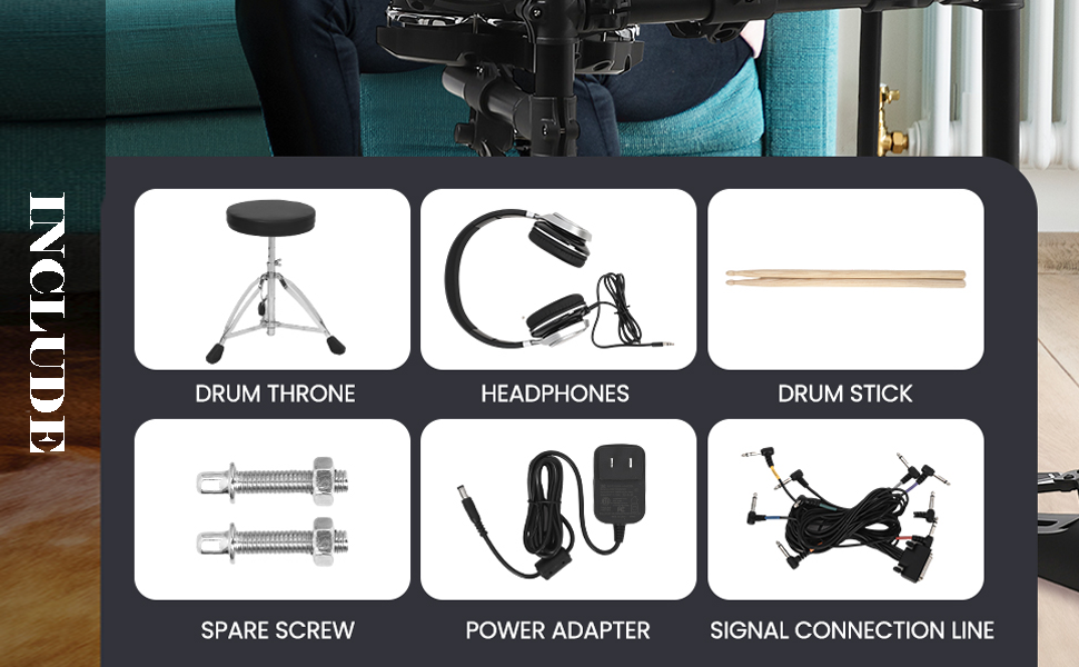 【الملحقات الكاملة وضمان ما بعد البيع】يتم تضمين كل ما تحتاجه: حامل معدني حديدي قابل للطي مع حامل ألومنيوم ثابت وآمن بأربعة أعمدة، والتحكم في القبعة العالية، ودواسة طبلة الجهير، وسماعات الرأس، وعرش الطبل، وكابل الصوت، وأعواد الطبل. إذا كان لديك أي مشاكل مع المنتجات التي تتلقاها، يرجى الاتصال بنا في أي وقت. نحن نقدم خدمة عملاء على مدار 24 ساعة وسياسة إرجاع غير مشروطة لمدة 7 أيام، يمكنك الاطمئنان عند شراء منتجاتنا.