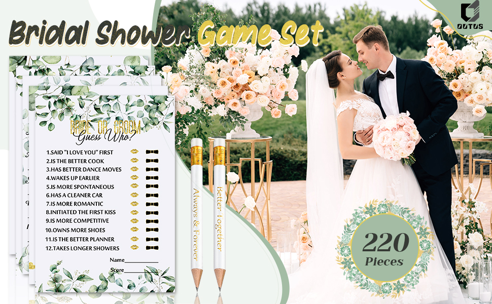 مجموعة ألعاب دش الزفاف 220 قطعة من Outus، بطاقات ألعاب الزفاف، بطاقات الأوكالبتوس والليمون، مستلزمات ألعاب الزفاف وأقلام الرصاص وإكسسوارات الأنشطة للعروس والعريس وحفلات الزفاف (نمط أخضر)
