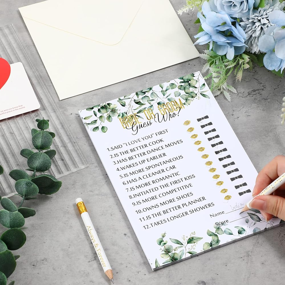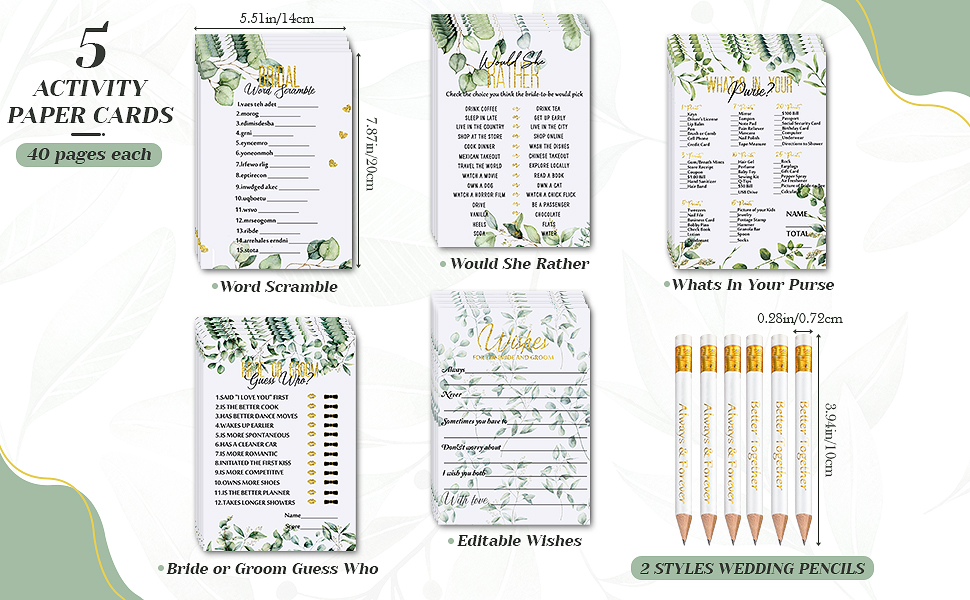 أقلام رصاص رائعة: يمكن كتابة بطاقات ألعاب العزوبية هذه ببعض الكلمات، وستكون مستعدًا جيدًا مع 20 قلم رصاص رائع بموضوع الزفاف، بالإضافة إلى مجموعة هدايا حفل الزفاف الخضراء، والتي تم برونزها بعبارة "Happily Ever After" و"Better". معاً
