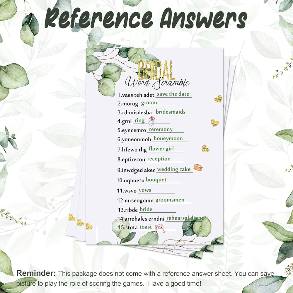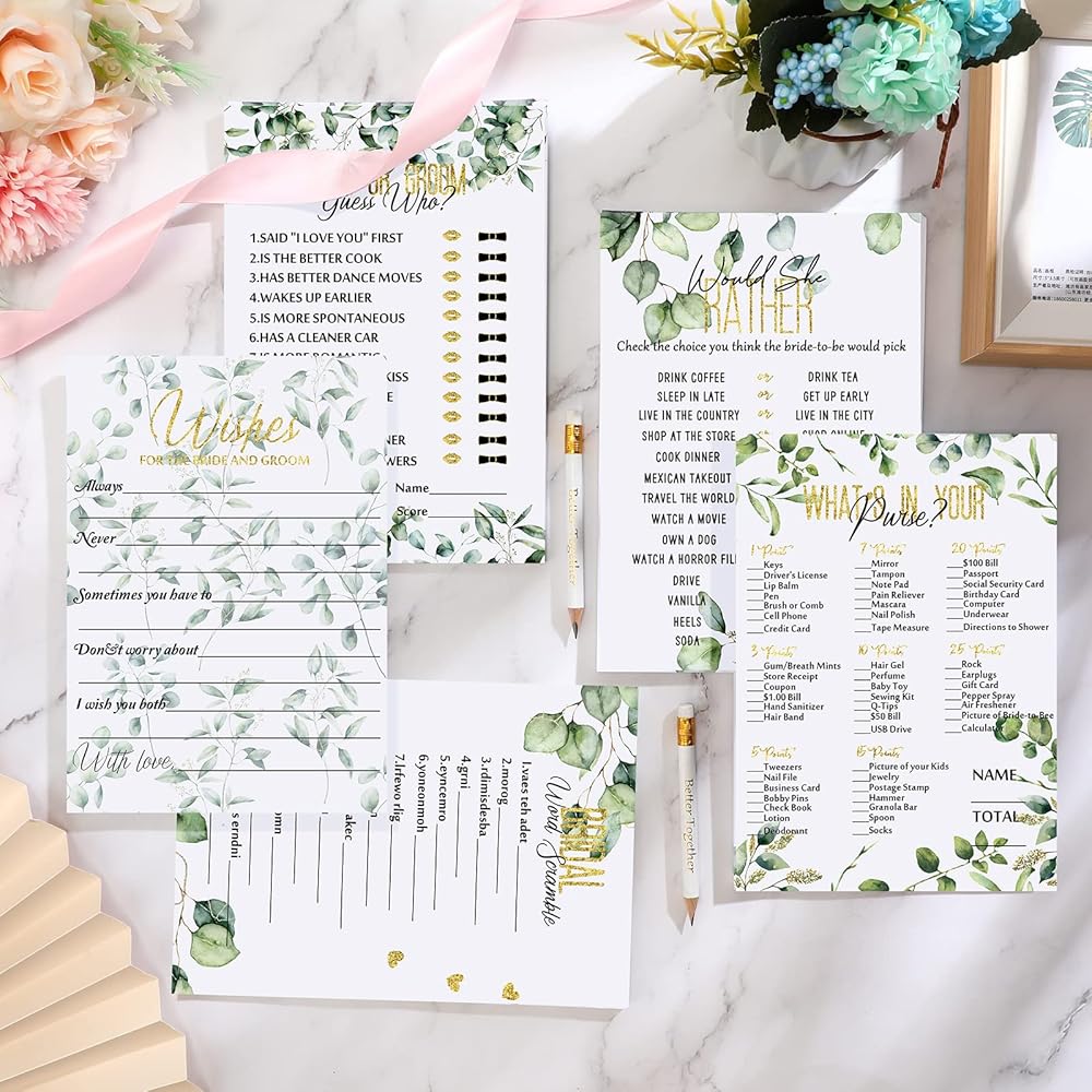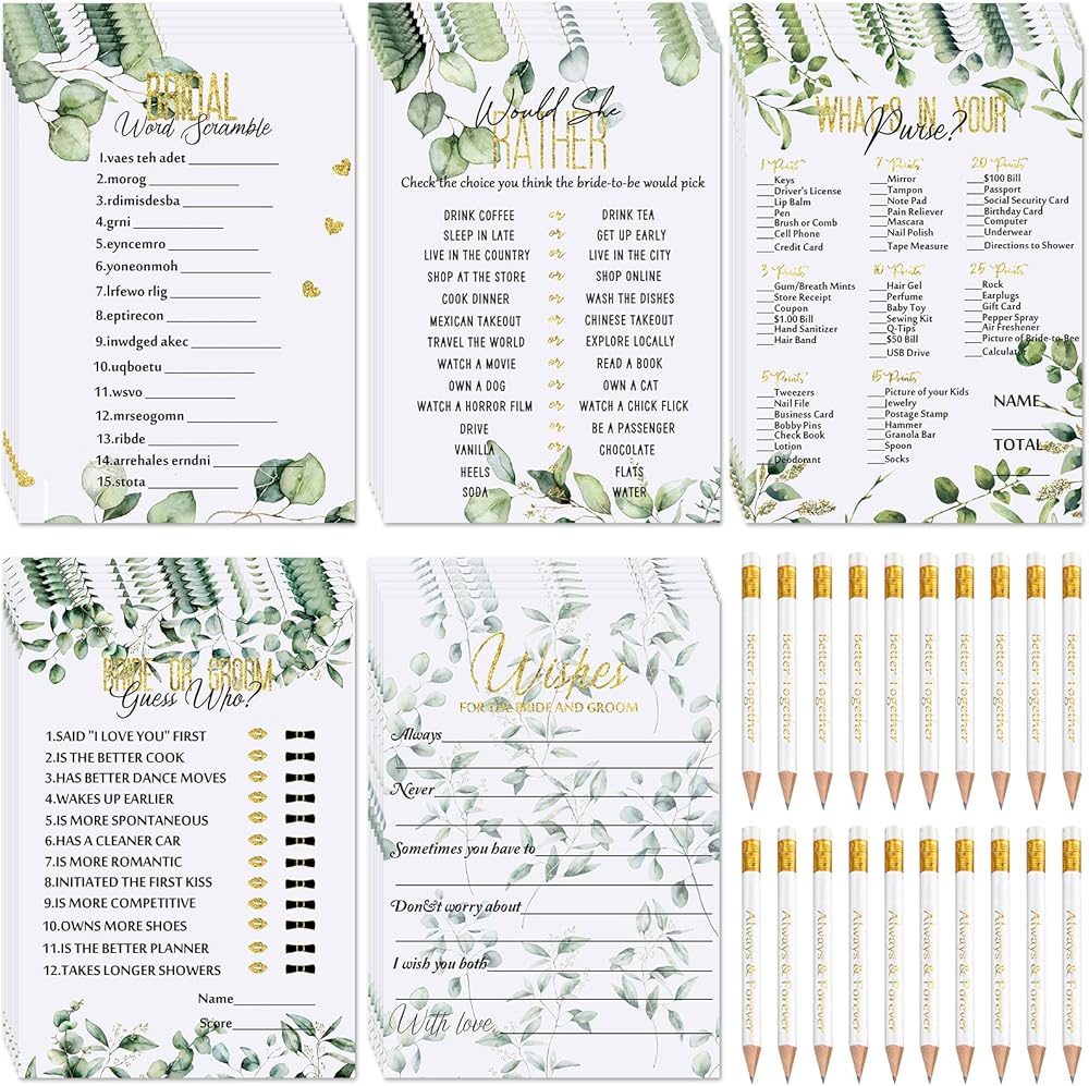 الألعاب المسلية: قد تحتاجين إلى فكرة حفل زفاف ممتعة ومبتكرة ومسلية؛ جرب بطاقات ألعاب حفل الزفاف هذه ذات اللون الأخضر، المطبوعة عليها "هل تفضل وخمن من"، و"العروس أم العريس"، و"Word Scramble"، و"Editable Wishes"، و"Whats In Your Purse"، وهي طريقة ممتعة للتعرف على كل منها. أخرى ويكون الانفجار في نفس الوقت