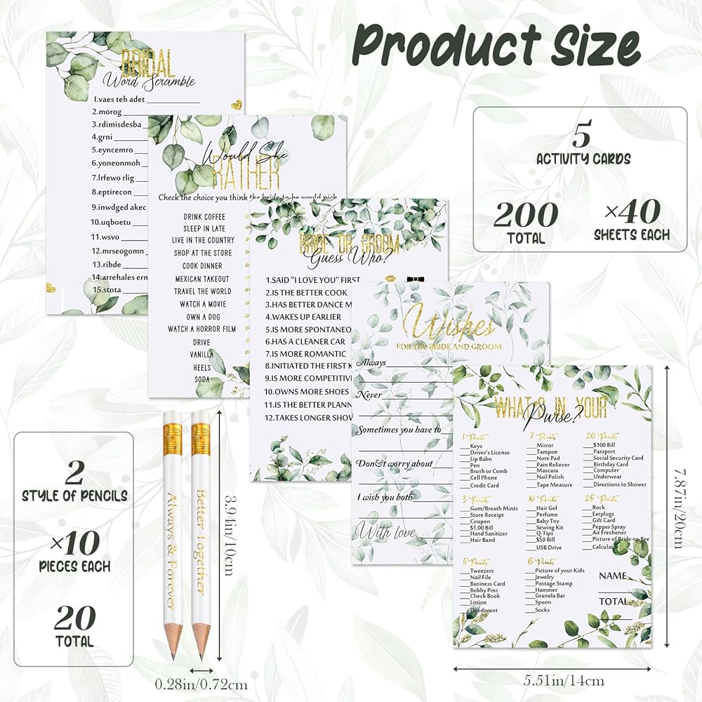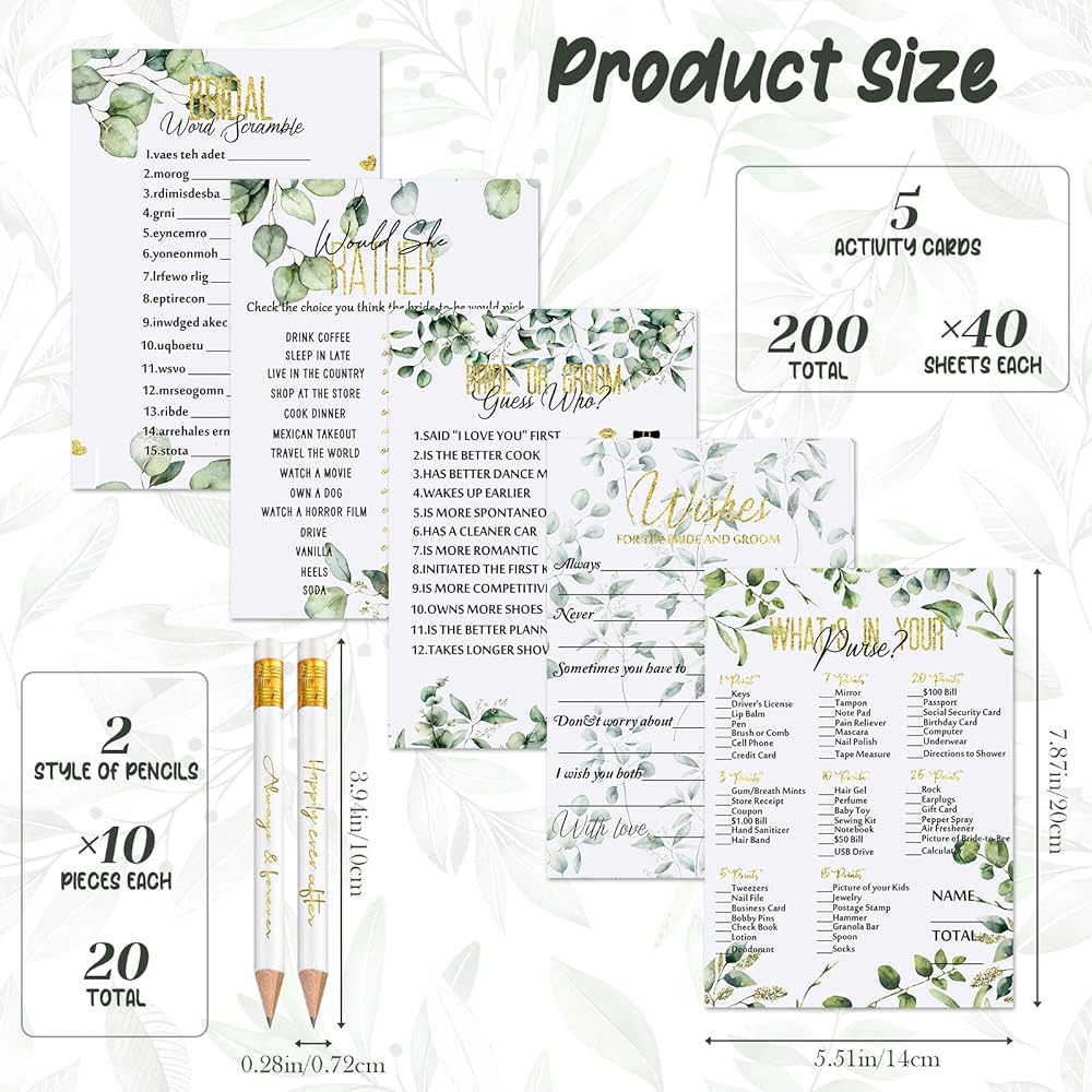مواد عالية الجودة: بطاقة ألعاب استحمام العروس من الأوكالبتوس بمقاس تقريبي. 14 × 20 سم/ 5.5 × 7.8 بوصة، مصنوعة من ورق عالي الجودة ومطبوعة بأنماط أوراق خضراء طبيعية، إضافة لطيفة لأي حفلة توديع العزوبية، أو حفل زفاف، أو حفل زفاف، أو حفل زفاف، أو ألعاب حفل زفاف.