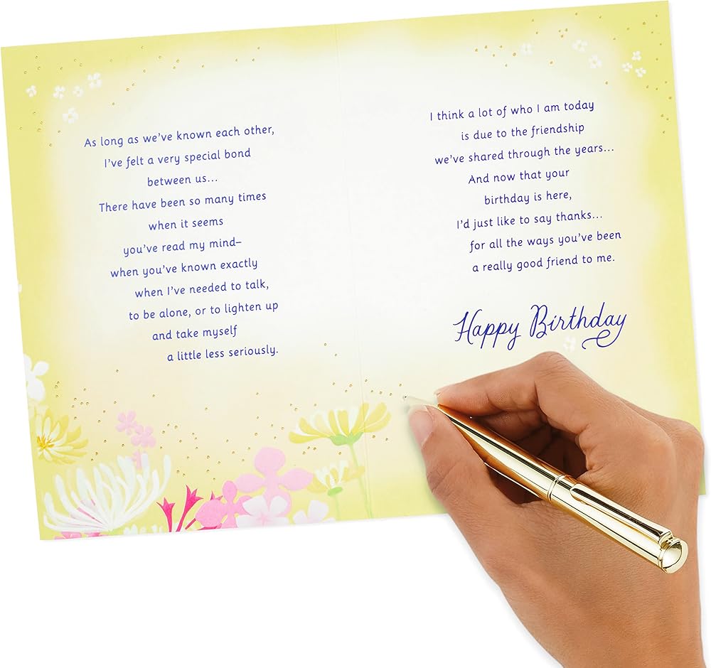 Inside reads: "As long as we've known each other, I've felt a very special bond between us . . . There have been so many times when it seems you've read my mind—when you've known exactly when I've needed to talk, to be alone, or to lighten up and take myself a little less seriously. I think a lot of who I am today is due to the friendship we've shared through the years . . . And now that your birthday is here, I'd just like to say thanks . . . for all the ways you've been a really good friend to me. Happy birthday."
