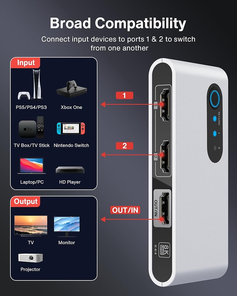 💠 وظائف HDMI 2.1 ثنائية الاتجاه متعددة الاستخدامات مزودة بثلاثة منافذ HDMI، وقم بتوصيل وحدتي تحكم للألعاب مثل PS5 وXbox Series X بسلاسة بشاشة عرض واحدة أو قم بالتبديل بسهولة بين شاشتين باستخدام جهاز واحد. (ملاحظة: في وضع 1-in-2-out، لا يمكن العرض المتزامن لكلتا الشاشتين.)