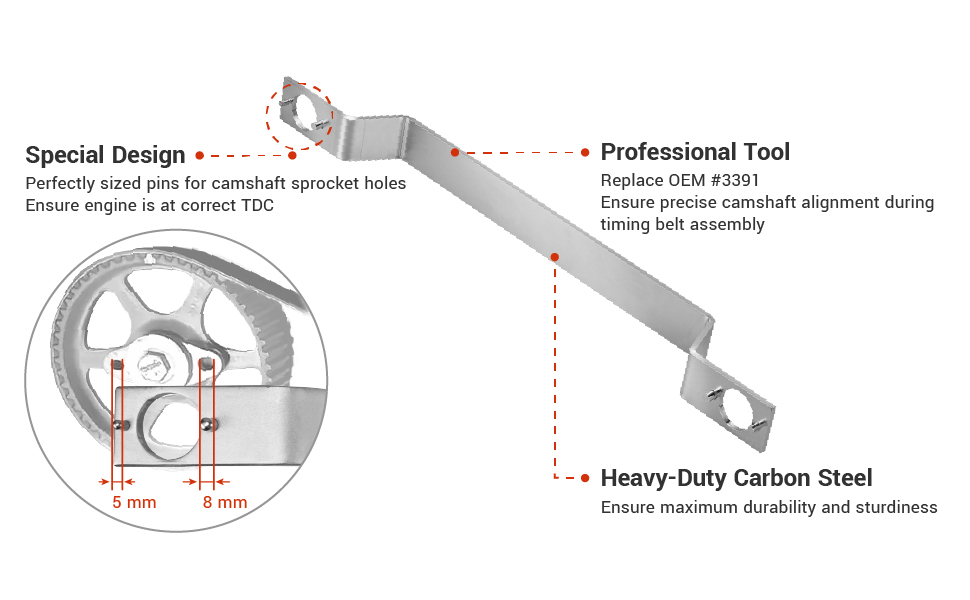 【دقيقة وخالية من التلف】يستبدل OEM #3391. اسمح بتثبيت أعمدة الكامات في مكانها عند TDC الصحيح أثناء تجميع حزام التوقيت أو رأس الأسطوانة، مما يضمن المحاذاة الدقيقة دون الإضرار بالمحرك.