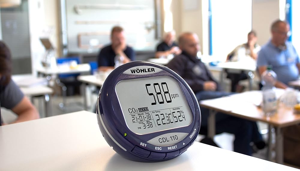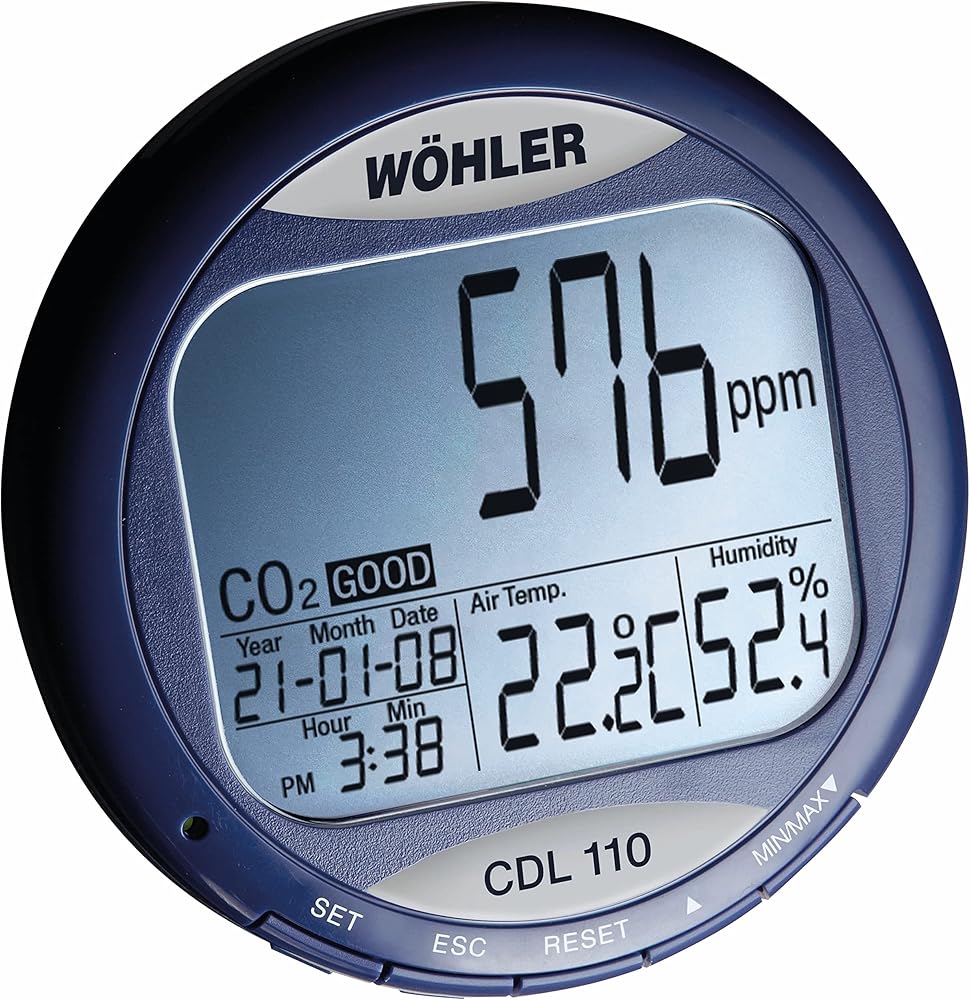 The Wöhler CDL 210 CO2 data logger and the Wöhler CDL 110 data monitor are CO2 measuring devices (colloquially also CO2 traffic lights) for continuous monitoring of the carbon dioxide concentration (in ppm) and other air quality factors. The CO2 meter is ideal for monitoring the CO2 concentration in buildings. The CO2 content is crucial for determining the indoor air quality and helps to optimize your own ventilation behavior. The air temperature and humidity are also displayed and support you in a problem analysis (such as discomfort, humidity, mold, concentration problems).