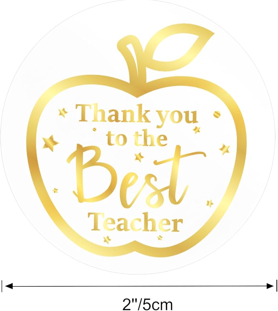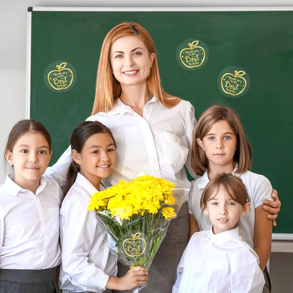 【Gold Apple Teachers Stickers】:Gold foil thank you to the best teacher font and apple pattern design on the clear stickers, elegant and shiny gold thank you appreciation teacher stickers are perfect for Teacher's Day party favors, school events, and graduation to appreciate your teacher.